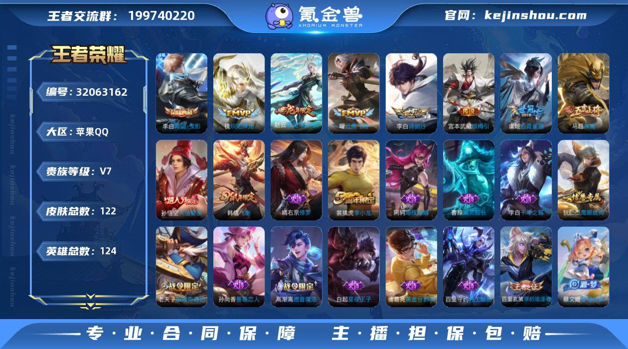 实名: 可修改 性别: 男号 贵族等级: V7 英雄数: 124 皮肤数: 122 荣耀水晶: 鸣剑·曳影 传说皮: 云鹰飞将,炽阳神光,云霓雀翎,惊梅引,乘龙·铭钟鼎 限定皮: 李小龙,天狼溯光者,神威,飞衡,大圣娶亲,诗剑行