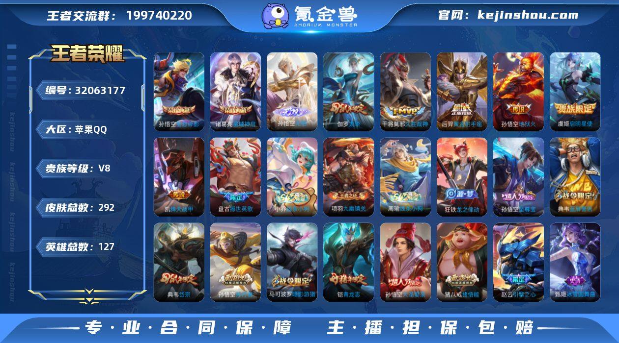 实名: 可修改 性别: 男号 贵族等级: V8 英雄数: 127 皮肤数: 292 荣耀水晶: 全息碎影,星域神启 无双皮: 无相 传说皮: 黄金射手座,绛天战甲,久胜战神,地狱火 限定皮: 李小龙,梁祝,引擎之心,岱宗,乒乒小将,太华,逐梦之影,青龙志,至尊宝,大圣娶亲,高山流水,孙行者,猪悟能,五谷丰年 亮点: 【优质装备】:全息碎影(猴子典藏),星域神启(倪克斯贼亮),黄金射手座,绛天战甲(鸡嘴战神),久胜战神,地狱火