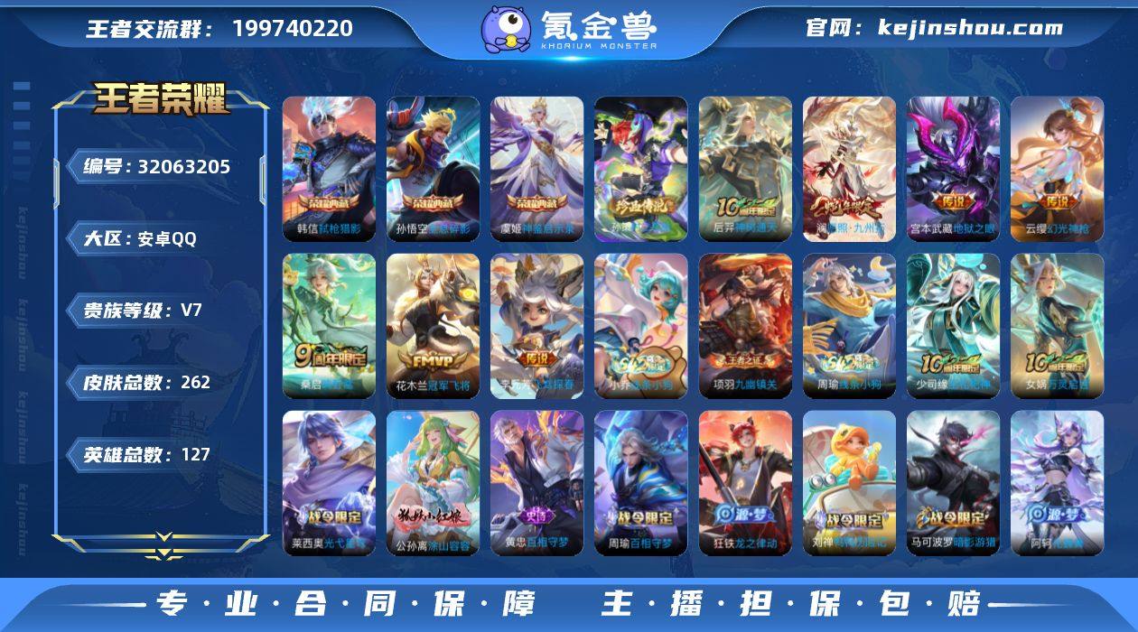 实名: 可修改 性别: 男号 贵族等级: V7 英雄数: 127 皮肤数: 262 荣耀水晶: 全息碎影,弑枪猎影,神鉴启示录 珍品传说: 时之奇旅-孙策 传说皮: 冠军飞将,地狱之眼,飞鸢探春,幻光神枪,神树通天 限定皮: 李小龙,傲雪梅枪,鸣野蒿,逐霄战戟,愿照·九州拓 亮点: 【优质装备】:全息碎影(猴子典藏),弑枪猎影(韩信典藏),神鉴启示录,冠军飞将,地狱之眼,飞鸢探春,涂山容容