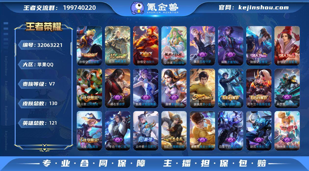 实名: 可修改 性别: 男号 贵族等级: V7 英雄数: 121 皮肤数: 130 荣耀水晶: 全息碎影 传说皮: 地狱火,神树通天 限定皮: 李小龙,至尊宝,大圣娶亲 亮点: 【优质装备】:全息碎影(猴子典藏),地狱火,涂山容容
