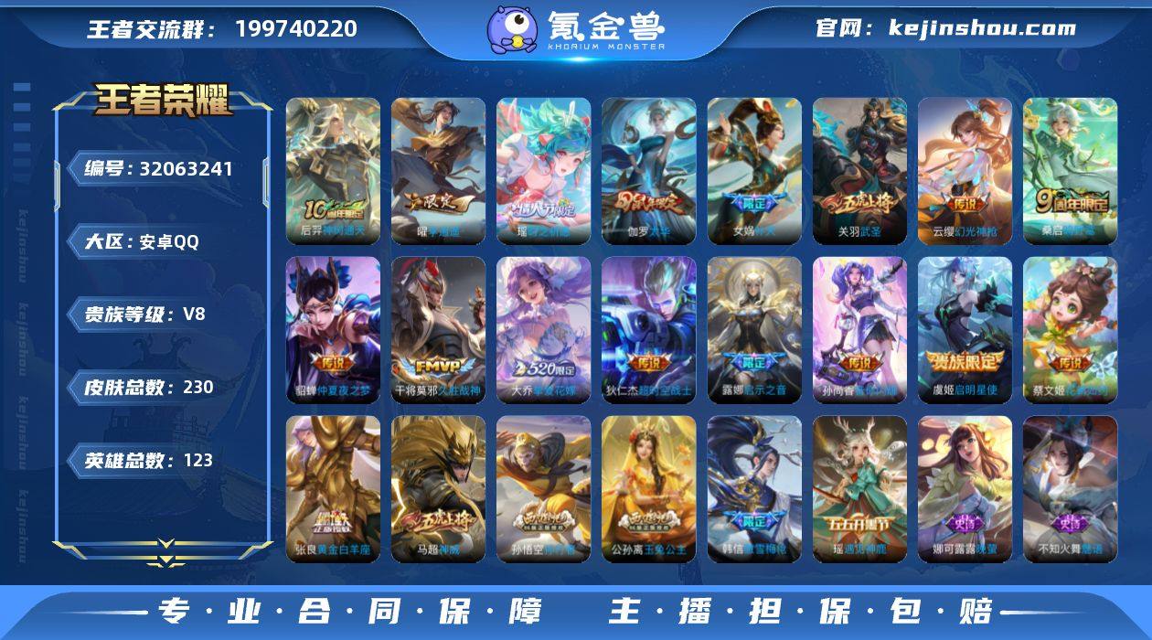 实名: 可修改 性别: 女号 贵族等级: V8 英雄数: 123 皮肤数: 230 传说皮: 黄金白羊座,久胜战神,仲夏夜之梦,李逍遥,超时空战士-狄仁杰,花朝如约,挚爱花嫁,音你闪耀,幻光神枪,神树通天 限定皮: 游园惊梦,武圣,神威,时之彼端,太华,天狼狩猎者,一生所爱,高山流水,孙行者,匿光追影者,女儿国国王,傲雪梅枪,时之祈愿-云中君,时之祈愿-瑶,补天,百木心枪,玉兔公主,启示之音,匿光启智者,五谷丰年,鸣野蒿