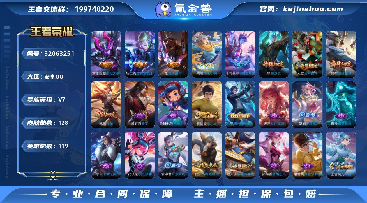 实名: 可修改 性别: 男号 贵族等级: V7 英雄数: 119 皮肤数: 128 传说皮: 绛天战甲,地狱之眼,超时空战士-狄仁杰 限定皮: 李小龙,梁祝,御风骁将,飞衡,冰霜恋舞曲,青龙志 亮点: 【优质装备】:绛天战甲(鸡嘴战神),地狱之眼,超时空战士-狄仁杰