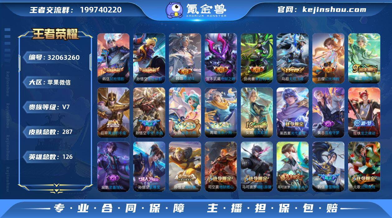 实名: 可修改 性别: 女号 贵族等级: V7 英雄数: 126 皮肤数: 287 荣耀水晶: 全息碎影,弑枪猎影 传说皮: 黄金射手座,末日机甲-孙尚香,零号·赤焰,地狱之眼,无双飞将,幻光神枪,踏浪归 限定皮: 李小龙,梁祝,美猴王,至尊宝,高山流水,孙行者,傲雪梅枪,山海·玄木吟,鸣野蒿 亮点: 【优质装备】:全息碎影(猴子典藏),弑枪猎影(韩信典藏),黄金射手座,末日机甲-孙尚香(绿蚂蚱),零号·赤焰,地狱之眼,无双飞将