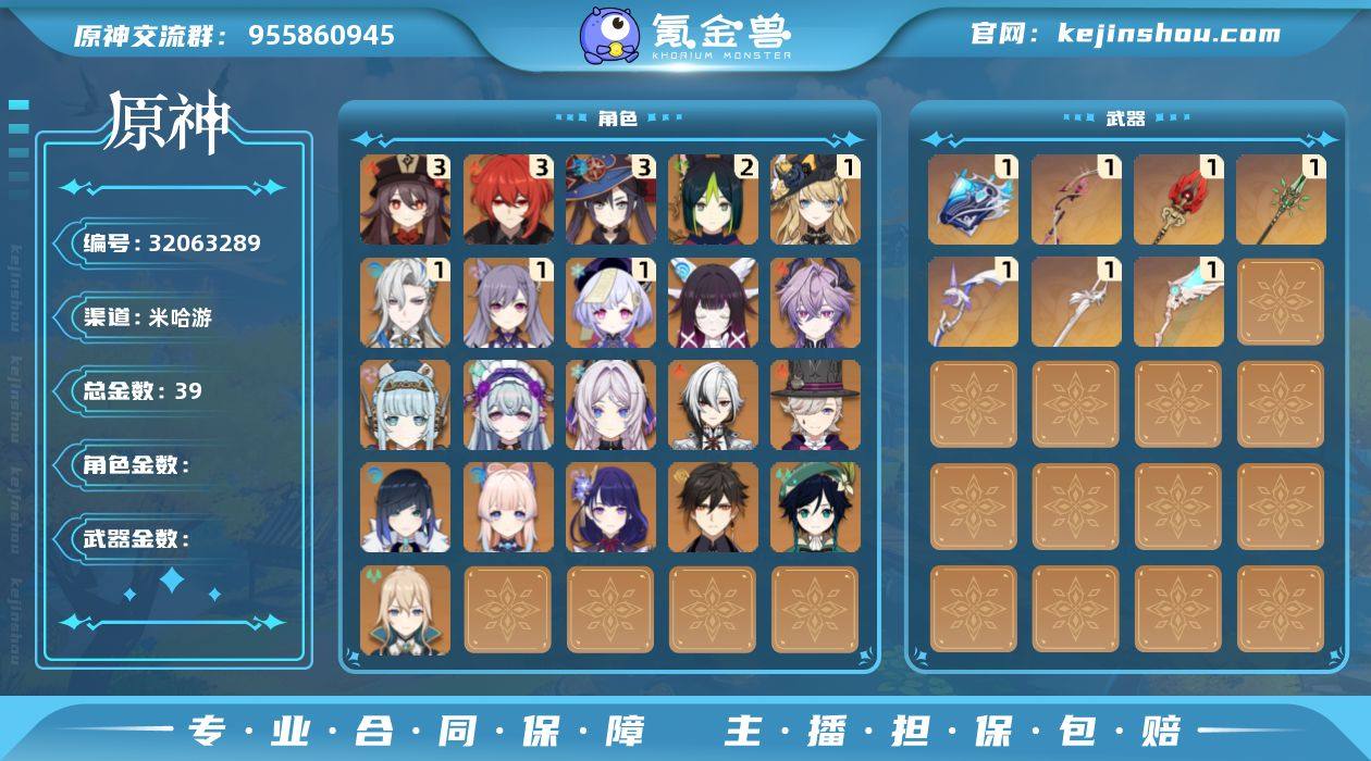 邮箱: 不送邮/死邮 总黄数: 39 冒险等级: 60 3命金色角色: 三命迪卢克,三命莫娜,三命胡桃 2命金色角色: 二命提纳里 1命金色角色: 一命七七,一命刻晴,一命那维莱特,一命娜维娅 0命金色角色: 温迪,钟离,琴,雷电将军,珊瑚宫心海,夜兰,林尼,阿蕾奇诺,茜特菈莉,梦见月瑞希,伊涅芙,杜林,哥伦比娅 1精武器: 天空之翼,和璞鸢,阿莫斯之弓,风鹰剑,护摩之杖,最初的大魔术,万世流涌大典
