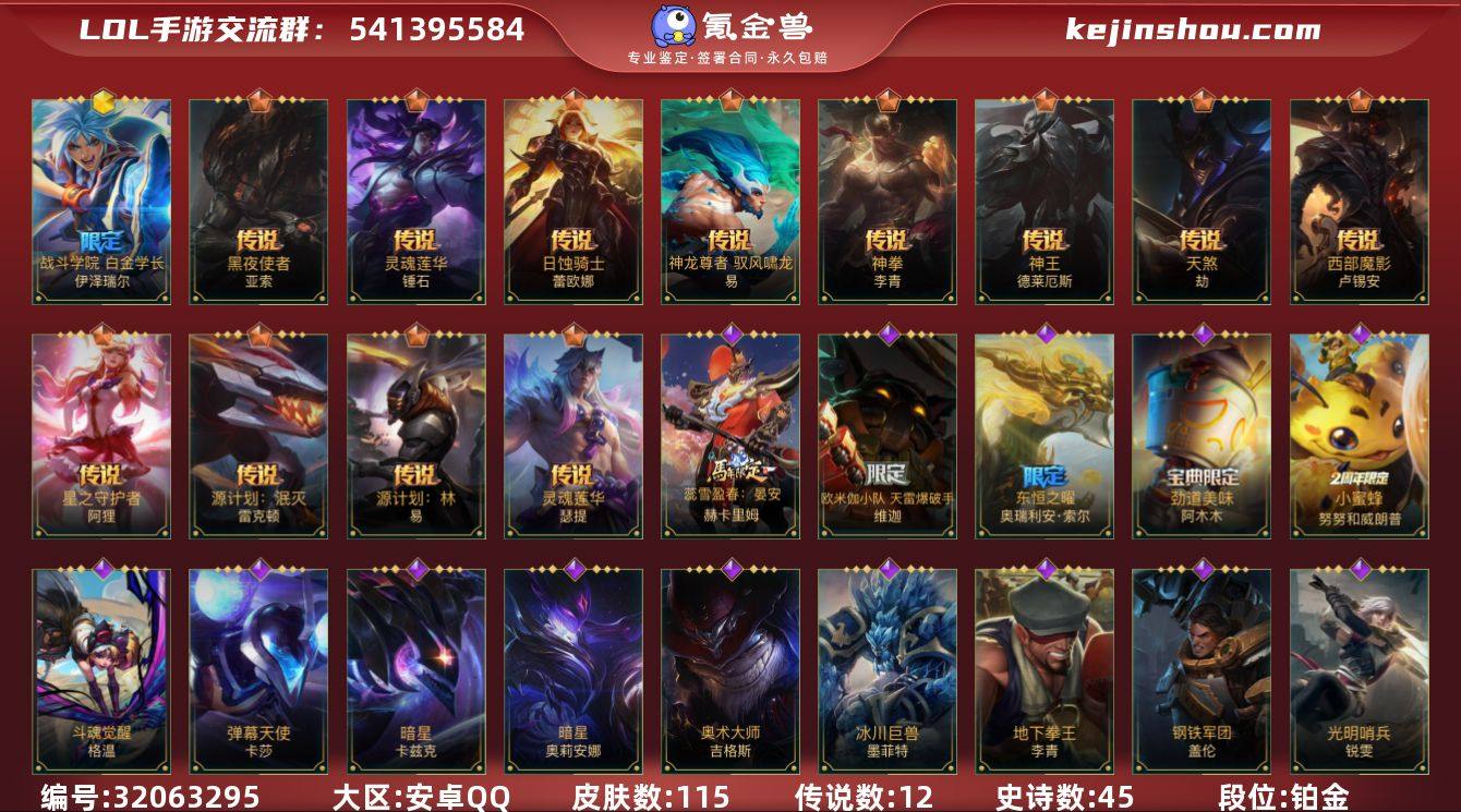 实名:不可二次实名 段位:铂金 英雄数:118 皮肤数:115 神话皮肤数量:1 传说皮肤数量:12 终极数:0 典藏皮肤数量:0 战斗学院EZ白金学长 黑夜使者亚索,灵魂莲华锤石,日蚀骑士蕾欧娜,神龙尊者 驭风啸龙,神拳盲僧,神王诺手,天煞劫,西部魔影卢锡安,星之守护者阿狸,源计划:泯灭,源计划:林,灵魂莲华腕豪 蕊雪盈春:晏安 赫卡里姆,欧米伽小队 天雷爆破手 维迦,东恒之曜奥瑞利安索尔,劲道美味 阿木木,小蜜蜂努努和威朗普,斗魂觉醒 格温,弹幕天使,暗星螳螂,暗星发条,奥术大师吉格斯,冰川巨兽石头人,地下拳王,钢铁军团,光明哨兵锐雯,K/DA ALL OUT寡妇,猎龙勇士奥拉夫,灵魂烈焰,灵魂收割者,灵能特工剑圣,灵能特工天使,末路管家,暮星之羽,奈落之炎,破败军团龙女,丧尸努努,神龙尊者 苍龙,未来战士慎,武神,无限烈焰,西部魔影诺手,西部牛仔,腥红之月皎月,星之守护者女枪,星之守护者萨勒芬妮,星之守护者赛娜,驯龙女巫,泳池派对女警,泳池派对发条,玉剑传说 无极,战斗教授男枪,小蜜蜂提莫,未来战士剑姬,心之钢永恩,冰糖葫芦维迦 声威黠影 提莫,兄弟已百暴!泰达米尔,龙冕神策吉格斯,光耀之灵,迅剑,黯黑魔龙龙女,暗黑女武神皎月,暗影,冰霜之刃,冰霜烈焰,冰霜亚龙,超级英雄,冲击之刃劫,穿着正装的恶魔,单身贵族,刀锋女王,德莱德莱,抵抗军战姬,鳄霸,绯金鮫灵(可升级),绯金魅影(可升级),绯金丽刃(可升级),绯金战斧(可升级),钢铁意志,哥特女仆,光耀之芒金克丝,光耀之刃蛮王,光耀之心发条,国王,海上霸主,黑暗骑士布兰德,黑暗骑士牛头,科学狂人,猎龙勇士薇恩,末世天使,哞利斯塔,女帝,女皇,女警官,偶像歌手,热血班长,熔火之心,时之砂,碎桶者,王牌舰长,五连摇滚键盘手,无畏号,西部牛仔亚索,先驱行者,小小骑士,焰尾妖狐,王牌上将皇子,王牌勇将,王牌司令艾希,龙冕先锋赵信 卖家说:历史小国剑圣,金铲铲还有东西