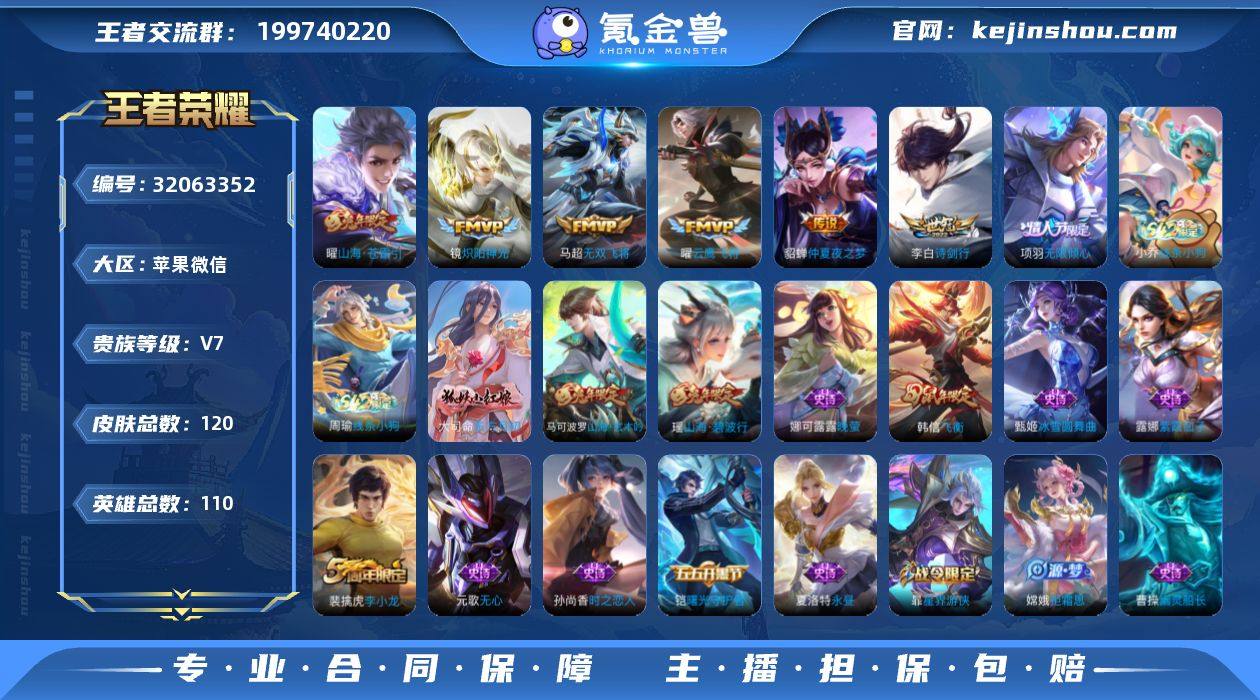 实名: 可修改 性别: 男号 贵族等级: V7 英雄数: 110 皮肤数: 120 传说皮: 云鹰飞将,炽阳神光,仲夏夜之梦,无双飞将,山海·苍雷引 限定皮: 李小龙,飞衡,诗剑行,山海·玄木吟,山海·碧波行,无限倾心-项羽