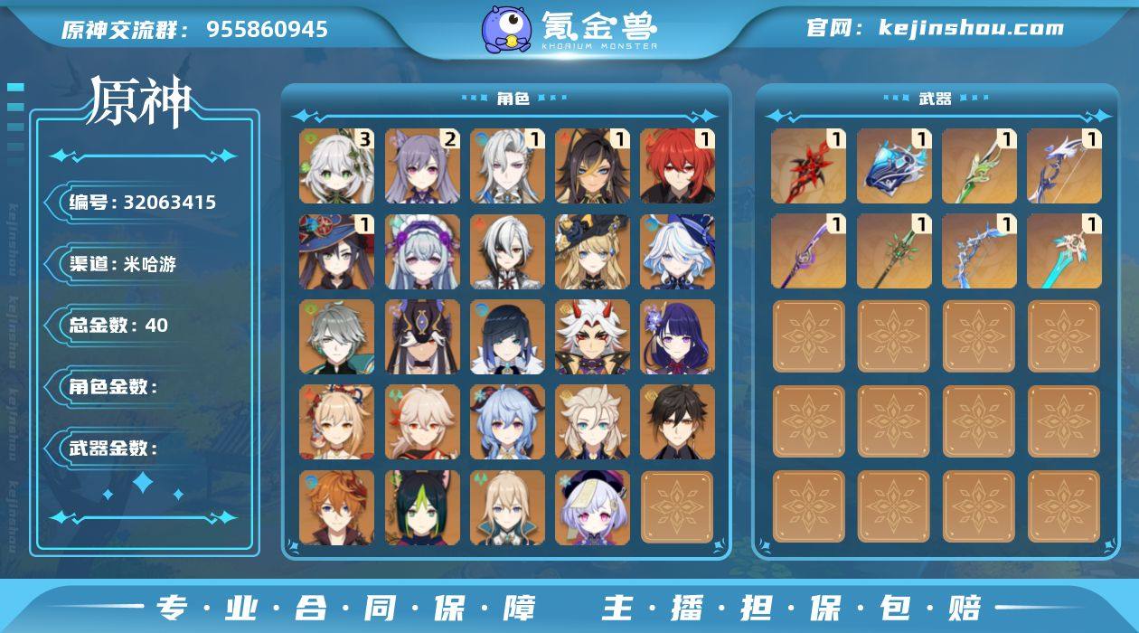邮箱: 不送邮/死邮 总黄数: 40 冒险等级: 60 3命金色角色: 三命纳西妲 2命金色角色: 二命刻晴 1命金色角色: 一命迪卢克,一命莫娜,一命迪希雅,一命那维莱特 0命金色角色: 枫原万叶,宵宫,七七,达达利亚,钟离,琴,阿贝多,甘雨,雷电将军,荒泷一斗,夜兰,提纳里,赛诺,艾尔海森,芙宁娜,娜维娅,阿蕾奇诺,梦见月瑞希 1精武器: 和璞鸢,天空之刃,薙草之稻光,冬极白星,若水,裁叶萃光,万世流涌大典,赤月之形