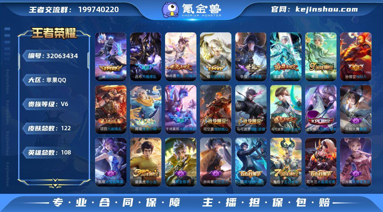 实名: 可修改 性别: 男号 贵族等级: V6 英雄数: 108 皮肤数: 122 传说皮: 炽阳神光,一念神魔,地狱火,澜逐花归海,乘龙·问璇玑 限定皮: 李小龙,梁祝,时雨天司,天魔缭乱,冰霜恋舞曲,天狼绘梦者,五谷丰年,山海·玄木吟,鸣野蒿 亮点: 【优质装备】:炽阳神光,一念神魔,地狱火,澜逐花归海
