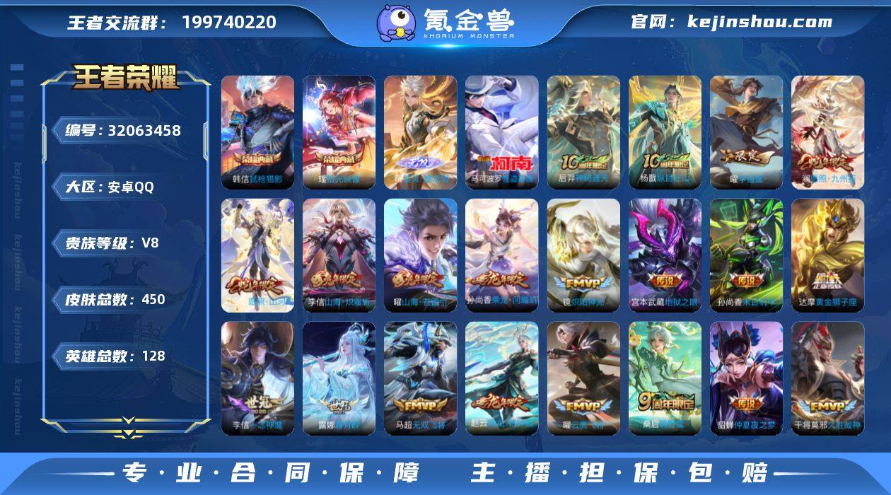 实名: 可修改 性别: 男号 贵族等级: V8 英雄数: 128 皮肤数: 450 荣耀水晶: 弑枪猎影,拾光映像 无双皮: 器灵·螭龙剑 珍品传说: 怪盗基德 传说皮: 黄金狮子座,云鹰飞将,久胜战神,炽阳神光,一念神魔,末日机甲-孙尚香,仲夏夜之梦,地狱之眼,飞鸢探春,胖达荣荣,李逍遥,时之恋人-刘备,无双飞将,山海·炽霜斩,山海·苍雷引,妄想实况,霜月吟,乘龙·问璇玑,乘龙·铭钟鼎,神树通天,纵目迁山 限定皮: 遇见飞天,李小龙,游园惊梦,梁祝,辉光之辰,岱宗,蜜橘之夏,青春决赛季,梅西,至尊宝,大圣娶亲,高山流水,圣诞老人,孙行者,傲雪梅枪,五谷丰年,诗剑行,山海·玄木吟,鸣野蒿,陌上桑,逐霄战戟,愿照·山河定,愿照·九州拓 亮点: 【优质装备】:弑枪猎影(韩信典藏),拾光映像(瑶典藏),器灵·螭龙剑,怪盗基德,黄金狮子座,云鹰飞将(小将军),久胜战神,炽阳神光,一念神魔,末日机甲-孙尚香(绿蚂蚱),仲夏夜之梦(大飞蛾),地狱之眼,飞鸢探春,胖达荣荣,李逍遥,时之恋人-刘备(电焊工),无双飞将,山海·炽霜斩(李信年限),山海·苍雷引(电光曜子),妄想实况,霜月吟,涂山容容