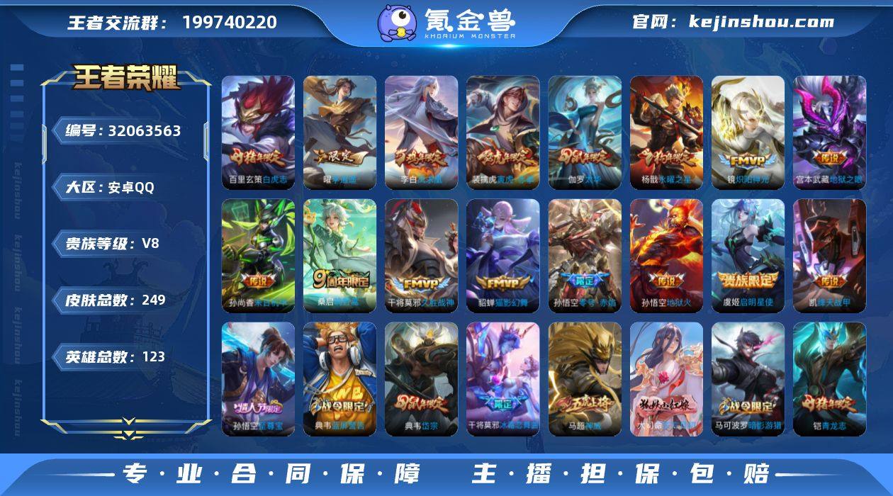 实名: 可修改 性别: 男号 贵族等级: V8 英雄数: 123 皮肤数: 249 传说皮: 绛天战甲,猫影幻舞,久胜战神,炽阳神光,末日机甲-孙尚香,地狱火,零号·赤焰,地狱之眼,李逍遥 限定皮: 冰锋战神,李小龙,引擎之心,白鹤梁神女,辉光之辰,岱宗,天狼溯光者,神威,永曜之星,时之彼端,太华,天狼征服者,天狼狩猎者,冰霜恋舞曲,逐梦之光,神奇女侠,天狼绘梦者,凤求凰,白虎志,青龙志,瑞麟志,朱雀志,至尊宝,一生所爱,大圣娶亲,寅虎·赤拳,鸣野蒿 亮点: 【优质装备】:绛天战甲(鸡嘴战神),猫影幻舞,久胜战神,炽阳神光,末日机甲-孙尚香(绿蚂蚱),地狱火,零号·赤焰,地狱之眼,李逍遥