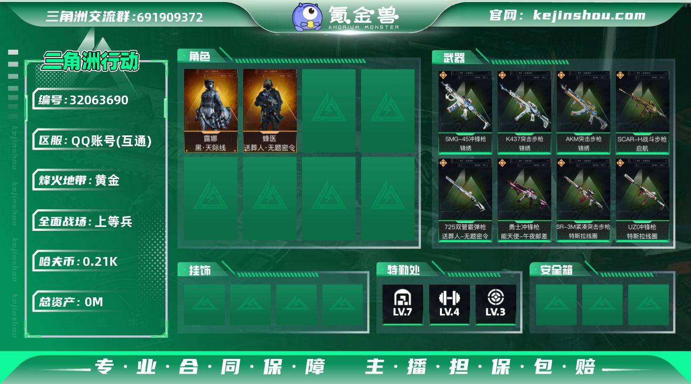 实名: 可修改 烽火地带段位: 黄金 全面战场段位: 上等兵 总资产: 423 哈夫币: 215 干员外观: 蜂医-送葬人·无题密令(S5),露娜-黑·天际线 传说武器皮肤: M7战斗步枪-神秘艺术,SR-25射手步枪-水墨云图,AS Val突击步枪-蛇年祥瑞,SMG45冲锋枪-骑士,725双管霰弹枪-送葬人-无题密令,M4A1突击步枪-阿米娅,CAR-15突击步枪-阿米娅,复合弓-黑-天际线,Vector冲锋枪-狩猎时刻,G3战斗步枪-狩猎时刻,M16A4突击步枪-狩猎时刻,AK-12突击步枪-特斯拉线圈,SR-3M紧凑突击步枪-特斯拉线圈,UZI冲锋枪-特斯拉线圈,勇士冲锋枪-能天使-午夜邮差,SCAR-H战斗步枪-启航,SMG-45冲锋枪-锦绣,K437突击步枪-锦绣,AKM突击步枪-锦绣