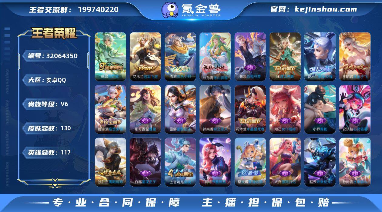 实名: 可修改 性别: 女号 贵族等级: V6 英雄数: 117 皮肤数: 130 传说皮: 冠军飞将 限定皮: 梁祝,天狼溯光者,幽恒,凤凰于飞,默契交锋-花木兰,鸣野蒿 亮点: 【优质装备】:冠军飞将,涂山容容