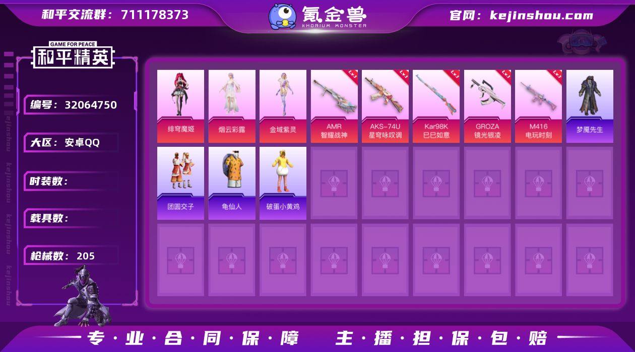 WJ604【4粉装6特效枪】安卓Q-4粉装6特效枪5热门165套装205枪皮 61837热力值 15印记 历史超级王牌15星 【4粉装】 绯穹魔姬 烟云彩露 金域紫灵 智耀战神 【6特效枪】 M416-电玩时刻 (5级) AKS-74U-星穹咏叹调 (7级) Kar98K-巳巳如意 (5级) DP-28-豹影疾电 (5级) AMR-智耀战神 (7级) GROZA-镜光银凌 (5级) 【5热门】 龟仙人 梦魇先生 团圆交子 破蛋小黄鸡 极速红龙 【1飞行器】 萌物绒绒飞行器 【1背包】 深海小丑鱼背包 营地ID:711948734