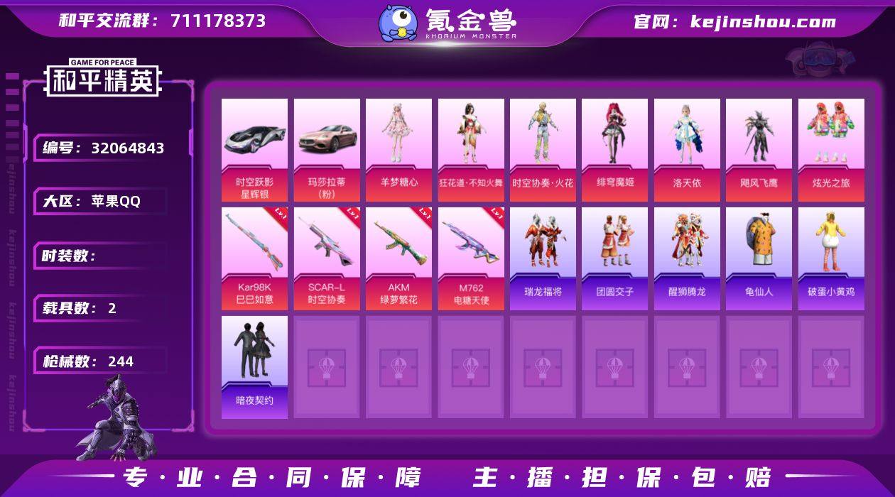 DYH17712【2载具11粉装5特效枪 洛天依 狂花道·不知火舞 绯穹魔姬时空协奏·火花粉玛莎】苹果Q-1稀有2载具11粉装5特效枪12热门166套装244枪皮 73844热力值 10印记 历史超级王牌6星【1稀有】 AKM-缤纷海域 【2载具】 玛莎拉蒂粉色 时空跃影(星辉银) 【11粉装】 万古烈焰 狂花道·不知火舞 绯穹魔姬 时空协奏·火花 洛天依 炫光之旅 羊梦糖心 宙之时溯 星云暗核 飓风飞鹰 暗星紫秘【5特效枪】 SCAR-L-时空协奏 (3级) AKM-绿萝繁花 (5级) Kar98K-巳巳如意 (5级) M762-电糖天使 (7级) DP-28-豹影疾电 (5级)【12热门】 龟仙人 暗夜契约 醒狮腾龙 团圆交子 瑞龙福将 破蛋小黄鸡 极速红龙 弄潮海豚 AKM-奇异狩猎者 M762-奇异狩猎者 M762-瑞龙福将 S686-奇异狩猎者【2飞行器】 星之彼岸飞行器 万古烈焰飞行器【1背包】 甜心宝贝背包 AKM-破晓战魂 AKM-霓虹街区 AKM-夜灯 AKM-涂鸦街区 AKM-彩虹符号 AKM-萌趣颜团子 AKM-虎虎生威 AKM-环太平洋 AKM-江南烟雨 AKM-霓彩脉冲 M16A4-蓝色火焰 M16A4-红色方程式 M16A4-莲影清波 M16A4-冰河战士 SCAR-L-红色方程式 SCAR-L-玉兔迎春 SCAR-L-星途旅人 SCAR-L-海盐豹豹 M416-夜灯 M416-蓝色火焰 M416-红色方程式 M416-糯团青竹 汤姆逊-幻影战神 汤姆逊-耀粉歌者 汤姆逊-异彩先驱 汤姆逊-天降萌叽 汤姆逊-纯真浪花 野牛-王牌四分卫 野牛-夜灯 野牛-青春冒险家 野牛-天星战神 野牛-雏菊兔兔 野牛-燕燕于飞 MP5K-怪笑疯兔 MP5K-异彩先驱 AKS-74U-鸡智如我 JS9-凌霄紫焰 P90-飞驰魅影 P90-快闪甜心 P90-玩趣呆呆 P90-巳巳如意 Kar98K-红色方程式 Kar98K-彩虹符号 Kar98K-炫彩节奏 Kar98K-飞驰魅影 M24-治愈之星 M24-炫彩节奏 AWM-焰鹰斗篷 AWM-纯真浪花 营地号:797292842