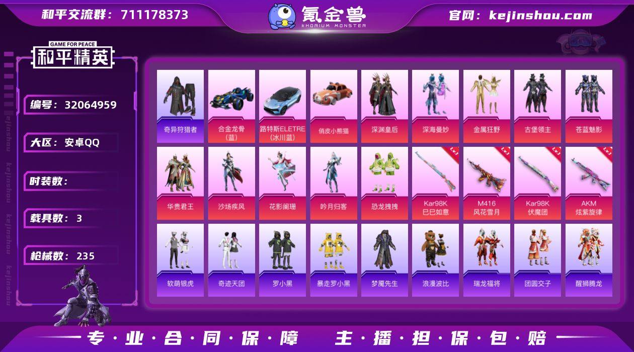 ZMH1253【春节不打烊特价出售 身法号3载具10粉装5特效枪 暗影哥特】安卓Q-1稀有3载具10粉装5特效枪34热门195套装235枪皮 81554热力值 8印记 历史超级王牌5星 【1稀有】 奇异狩猎者 【3载具】 路特斯EL蓝色 合金龙骨蓝色 俏皮小熊猫 【10粉装】 深海曼妙 深渊皇后 金属狂野 华贵君王 古堡领主 苍蓝魅影 恐龙拽拽 沙场疾风 花影阑珊 吟月归客 【5特效枪】 AKM-炫紫旋律 (5级) Kar98K-巳巳如意 (4级) Kar98K-伏魔团 (5级) DP-28-豹影疾电 (1级) M416-风花雪月 (5级) 【34热门】 奇迹天团 龟仙人 雪山精英 梦魇先生 软萌银虎 奇迹天团 暴走罗小黑 九霄 浪漫波比 罗小黑 暗夜契约 暗影哥特 醒狮腾龙 团圆交子 瑞龙福将 纯白誓言 粉红小猪 漫步者 青龙圣者 机械英豪 破蛋小黄鸡 风华少年志 白月香洋装 新侠客行 黑色刀锋 极速红龙 赛博空间 英勇保护者 不夜海上花 M762-瑞龙福将 M249-古堡领主 S686-奇异狩猎者 AUG-魔法学院 Kar98K-古堡领主 【2飞行器】 潮汐统领飞行器 齐天大圣飞行器 【6头盔】 精灵迷巫头盔 雪国精灵头盔 火曜朱雀头盔 金风玉露头盔 静灵氛围头盔 放客神游头盔 【7背包】 银河战甲背包 金曜白虎背包 金风玉露背包 金属狂野背包 深海曼妙背包 古堡领主背包 夏日绵绵冰背包 营地ID:704963440