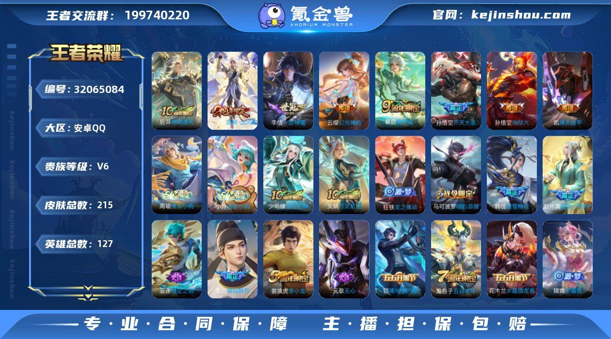 【WZ181090】215皮肤-8传说-46史诗【传说皮肤】:后羿神树通天,司空震愿照山河定,云缨幻光神枪,桑启鸣野蒿,孙悟空齐天大圣,铠绛天战甲,李信一念神魔,孙悟空地狱火【限定皮肤】:姜子牙天穹之誓,杨戬破阵退雄兵,李白谪仙醉月,狄仁杰阴阳师,赵云皇家上将,赵云百木心枪,孙尚香蔷薇恋人,高渐离玩趣恶龙,元歌无心,马可波罗暗影游猎,狄仁杰魔术师,狄仁杰万华元夜,达摩沙漠行僧,项羽海滩派对,老夫子醍醐杖,程咬金演武夺筹,韩信傲雪梅枪,兰陵王金庭之子,孙悟空齐天大圣,李元芳云中旅人,钟馗神迹守卫,钟馗驱傩正仪,蔡文姬繁星吟游,鬼谷子原初探秘者,鬼谷子五谷丰年,苏烈千军破阵,弈星混沌棋,沈梦溪星空之诺,沈梦溪大漠名商,明世隐疑决卦,裴擒虎李小龙,裴擒虎擒涛扼浪,云中君纤云弄巧,盾山御銮,猪八戒西部大镖客,嫦娥拒霜思,鲁班大师匿光启智者,鲁班大师探海日志,桑启海盐诗旅,张良古海寻踪,蒙犽百解令,鬼谷子天穹祈灯,沈梦溪龙舞盛年,刘邦剑破天穹,程咬金群星魔术团,关羽决胜骁骑,镜青焰无极,项羽苍威无极,刘备异域游侠,周瑜熔金海岸【年限皮肤】:司空震愿照山河定【赛季限定】:盾山御銮,弈星混沌棋,明世隐疑决卦,老夫子醍醐杖,鬼谷子原初探秘者,狄仁杰万华元夜,程咬金演武夺筹,钟馗驱傩正仪,苏烈千军破阵,达摩沙漠行僧,兰陵王金庭之子,沈梦溪大漠名商,李元芳云中旅人,桑启海盐诗旅,裴擒虎擒涛扼浪,鲁班大师探海日志,张良古海寻踪,鬼谷子天穹祈灯,刘邦剑破天穹,姜子牙天穹之誓,东皇太一噬灭天穹,太乙真人谧流熔炉,钟馗虚灵犬护,甄姬逆浪荇歌,亚瑟荣光之誓【战令限定】:钟馗神迹守卫,沈梦溪星空之诺,马可波罗暗影游猎,猪八戒西部大镖客,镜青焰无极,项羽苍威无极,亚连破空之剑,孙悟空神迹守卫,周瑜线条小狗,小乔线条小狗【史诗...