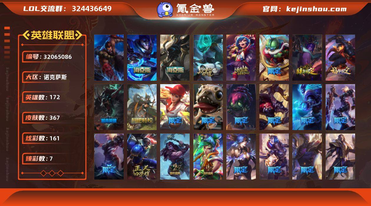 【LOLYT115】172英雄/367皮肤/1终极/5神话/48限定/7臻彩/161炫彩/37传说/92史诗/铂金/10周年 安妮/源代码 乐芙兰/10周年庆典 凤凰/海克斯 嘉文四世/海克斯 人马/银河魔装机神安妮/天龙之子 卡莎 飞龙乘云/无畏骑士 瑟庄妮 赤子初心/星之守护者 辛德拉 未来之光/霸天巨兽·雪崩 墨菲特/可爱可爱粉红红 布里茨/魔女 阿卡丽 虚荣/净雪之月 莫甘娜 冬虹/龙年 孙悟空/紫金罗刹 莫甘娜/福牛守护者 德莱厄斯/圣诞糖果棒 厄运小姐/“主人不要我了” 阿木木/平安夜女神 娑娜/英勇玩具兵船长/邪恶圣诞老人 维迦/冰雪节 茂凯/圣诞玩偶 波比/冰雪驯鹿 波比/圣诞驯鹿 克格莫/冰雪节 炼金/灵魂守卫/送披萨的小姐姐 希维尔/冠军之刃 锐雯/冠军典狱长 锤石/冠军之刃 锐雯 2016/S1FNC 迦娜/S1FNC 嘉文四世/S1FNC 卡尔萨斯/S2 暗杀星 发条/S2 暗杀星 努努/S3 SKT T1 劫/S3 SKT T1 李青/S4 SSW 图奇/S4 SSW 锤石/S5 SKT T1 蜘蛛/S6 SKT T1 奥拉夫/2周年 德莱厄斯/4周年 锐雯/胜利女神 奥莉安娜/胜利之剑 亚托克斯/胜利枪神 卢锡安/胜利机器人 布里茨/胜利女神 瑟庄妮/胜利凤凰 艾尼维亚/胜利之王 泰达米尔/胜利巨口 克格莫/胜利女神 娑娜/无头骑士 赫卡里姆/泳池派对 格雷福斯/外星装甲 库奇/暗影 沃里克/野兽猎人 瑟庄妮/都铎王朝 图奇/防暴天使 凯尔/惊悚派对 阿木木/克格汪/铁哥们儿 奥拉夫/魔幻卡牌 崔斯特/大天使长米迦勒 凯尔/源计划:林 易/恶魔男爵 瑞兹/霸天零式 赛恩/黎明使者索拉卡/欧米伽小队 幽灵特工/烈焰雄心 崔丝塔娜/战地巨兽 科加斯/双重冰晶 艾尼维亚/律政大亨 蒙多/冰霜之刃 艾瑞莉娅/最终BOSS 维迦/女警狙击 凯特琳/陆地王者4WD 布里茨/地狱行者 孙悟空/丧尸 布兰德/第三类接触 黑默丁格/屠龙勇士 潘森/腥红之月 鬼武姬 阿卡丽/钢铁军团 盖伦/黯黑魔龙 希瓦娜/焰尾妖狐 阿狸/符文战熊 沃利贝尔/苍穹之光 韦鲁斯/宇...