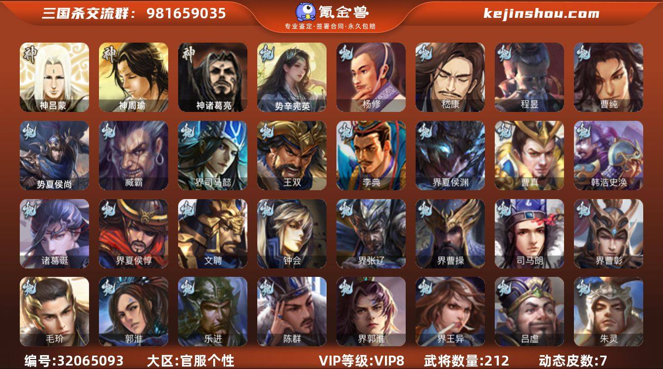 【14789382】官阶:领军将军;VIP等级:VIP8;史诗武将数量:10;动态皮肤数量:7;武将总数:212;史诗宝珠数量:11;将魂数量:2288;神将:1;魏国史诗武将:2;蜀国史诗武将:0;吴国史诗武将:1;群史诗武将:4 神诸葛亮,杨修,嵇康,曹纯,势辛宪英,程昱,界徐盛,左慈,麹义,沮授,许攸,神吕蒙,神周瑜,势夏侯尚,SP关羽,乐进,曹昂,诸葛诞,朱灵,文聘,SP姜维,钟会,曹冲,郭淮,满宠,界王异,界曹操,界司马懿,界夏侯惇,界张辽,界郭嘉,李典,曹真,韩浩史涣,陈群,曹叡,曹休,钟繇,司马朗,吕虔,鲁芝,界曹彰,界郭淮,蔡贞姬,王双,崔琰,毛玠,界夏侯渊,臧霸,势陈到,SP孙尚香,夏侯霸,马良,关兴张苞,廖化,关平,刘封,界法正,界刘备,界张飞,界赵云,界马超,SP徐庶,吴懿,周仓,张松,糜竺,界孟获,界祝融,杨仪,界简雍,糜夫人,王甫赵累,界周仓,谋庞统,界张嶷,谋孟获,谋张飞,谋祝融,诸葛果,蒋琬费祎,甘夫人,凌操,大乔小乔,诸葛恪,诸葛瑾,孙鲁育,程普,韩当,潘璋马忠,虞翻,界甘宁,界吕蒙,界黄盖,界周瑜,界大乔,界陆逊,孙鲁班,朱桓,顾雍,孙休,朱治,界孙权,界孙尚香,孙亮,孙邵,桥公,陈武董袭,蒋钦,谋韩当,谋周瑜,谋小乔,势鲁肃,友庞统,伏完,界袁术,SP赵云,伏皇后,李儒,界于吉,界张角,华雄,袁术,界华佗,公孙瓒,蔡夫人,公孙渊,张鲁,SP黄月英,界貂蝉,界庞德,界袁绍,张济,张绣,董承,星徐晃,界公孙瓒,胡车儿,谋刘赪,谋卢植,势田丰,乐就,神郭嘉-半醉山河,郝昭-死守陈仓(动态),麹义-扬刀立威(动态)