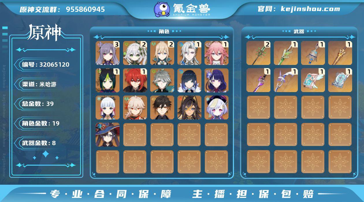 【YSYT1001】60级/39黄/女主/19个五星角色/8个五星武器/0命法尔伽/0命哥伦比娅/伊涅芙/钟离/枫原万叶/神里绫华/一命八重神子/雷电将军/艾尔海森/二命纳西妲/一命提纳里/一命那维莱特/夜兰/莫娜/二命琴/迪希雅/七七/三命刻晴/一命迪卢克/图莱杜拉的回忆/四风原典/和璞鸢/裁叶萃光/圣显之钥/雾切之回光/阿莫斯之弓/天空之卷