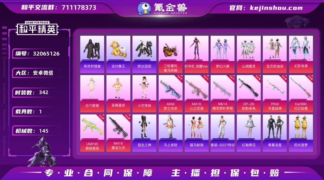 实名:不可二次实名 是否支持人脸包赔:支持 粉装数量:8 特效枪数量:8 载具数:1 时装数:342 枪械数:145 奇异狩猎者,胖达团团,派对舞王 宝贝奶油派,白勺歌姬,初号机 觉醒Ver.,呆萌星弥,幻彩电音,梦幻火箭,山涧鹿灵,小可学妹 七级AKM-梦之光华,七级M416-心之恋语,七级Mk14-精灵梦叶罗丽,五级DP-28-豹影疾电,五级Kar98K-巳巳如意,五级PKM-天星战神,三级UMP45-萌骑冒险,三级M416-墨龙九天 鬼马风驰 狙击之神,马上来财,福马献瑞,红釉青花,SS37特训,雨过天青,青翼流星,阳光菠萝,雪国风尚,SS36特训,奇异狩猎者,炫彩糖果,紫俏灵猫,风迹短诗,秘语星愿,SS35特训,午间小调,狂鲨锋刃,SS34特训套装,8号机,冰冻风暴,缤纷果语,白光莹,冰公主,长空猛禽,潮流炫酷,纯真浪花,顶瓜瓜,大橘大利,呆萌铁蟹,电音精灵,疯狂小兔子,龟仙人,鹤鸣,湖雨初晴,幻羽潜行,惊鸿侠骨,竞技名士,极速光影,锦衣飞扬,快乐星愿,龙的传人,龙魂突击队,浪漫天命,恋语绒绒,Mark.06,漫步者,摩登魅猫,懵萌河马,牛气满满,胖达团团,派对舞王,破蛋小黄鸡,情公主,青涩时光,热情海星,神气柴柴,SS11特训,SS12特训,SS14特训,SS19特训,SS23特训,SS25特训,SS27特训,SS28特训,SS30特训套装,SS31特训套装,SS32特训套装,SS33特训套装,SS9特训,巳巳如意,王牌教练,无暇誓言,旭日情侣,耀粉歌者,银尘,元气发射,鹰眼刺客,焰鹰斗篷,鱼渊荷华,幽夜迷踪,燕燕于飞,异域银装 炫彩糖果飞行器,梦幻火箭飞行器,星之彼岸飞行器,绝对恒星降落伞,炫彩糖果降落伞,异瞳寒姬降落伞,暗夜鎏金降落伞,白勺歌姬降落伞,创世·救赎降落伞,第五大道降落伞,鬼刀降落伞,精灵梦叶罗丽降落伞,江南烟雨降落伞,林间仙鹿降落伞,洛神天依降落伞,梦幻火箭降落伞,墨龙九天降落伞,圣堂之誓降落伞