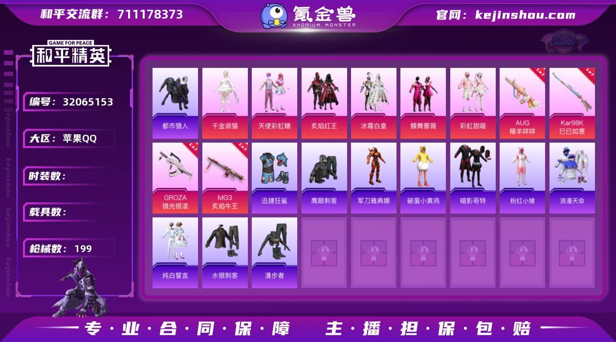 DYH17851【6粉装5特效 都市猎人 迅捷狂鲨 暗影哥特 浪漫天命】苹果Q-3稀有6粉装5特效枪12热门161套装199枪皮 59994热力值 10印记 历史超级王牌9星 【3稀有】 AKM-缤纷海域 都市猎人 浪漫天命 【6粉装】 天使彩虹糖 千金淑猫 冰霜白皇 炙焰红王 彩虹甜喵 蝶舞蔷薇 【5特效枪】 Kar98K-巳巳如意 (5级) DP-28-豹影疾电 (5级) AUG-暖羊咩咩 (5级) GROZA-镜光银凌 (5级) MG3-炙焰牛王 (7级) 【12热门】 鹰眼刺客 迅捷狂鲨 暗影哥特 纯白誓言 粉红小猪 水银刺客 漫步者 破蛋小黄鸡 极速红龙 军刀雅典娜 M762-奇异狩猎者 M24-奇异狩猎者 【3头盔】 梦幻火箭头盔 甜心宝贝头盔 幻影战神头盔 【2背包】 梦幻火箭背包 甜心宝贝背包 营地ID:774193315