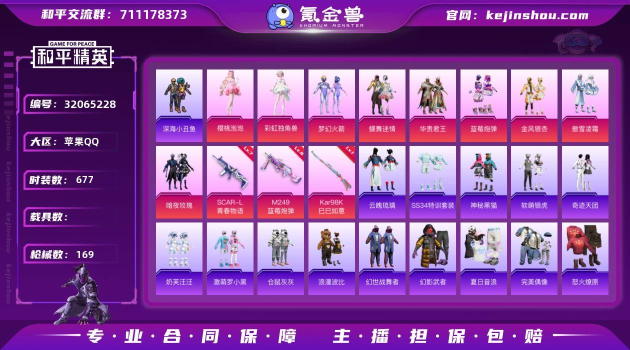 yy名: 不可修改 时装数: 677 枪械数: 169 战备数: 123 热门装扮: 梦幻火箭(新101),蝶舞迷情,深海小丑鱼,浪漫波比,华贵君王,暗夜玫瑰,蓝莓炮弹,金风银杏,傲雪凌霜,仓鼠灰灰,激萌罗小黑,奶芙汪汪,奇迹天团,软萌银虎,神秘黑猫,彩虹独角兽,樱桃泡泡 稀有枪皮: M249蓝莓炮弹,SCAR-L青春物语,Kar98K-巳巳如意