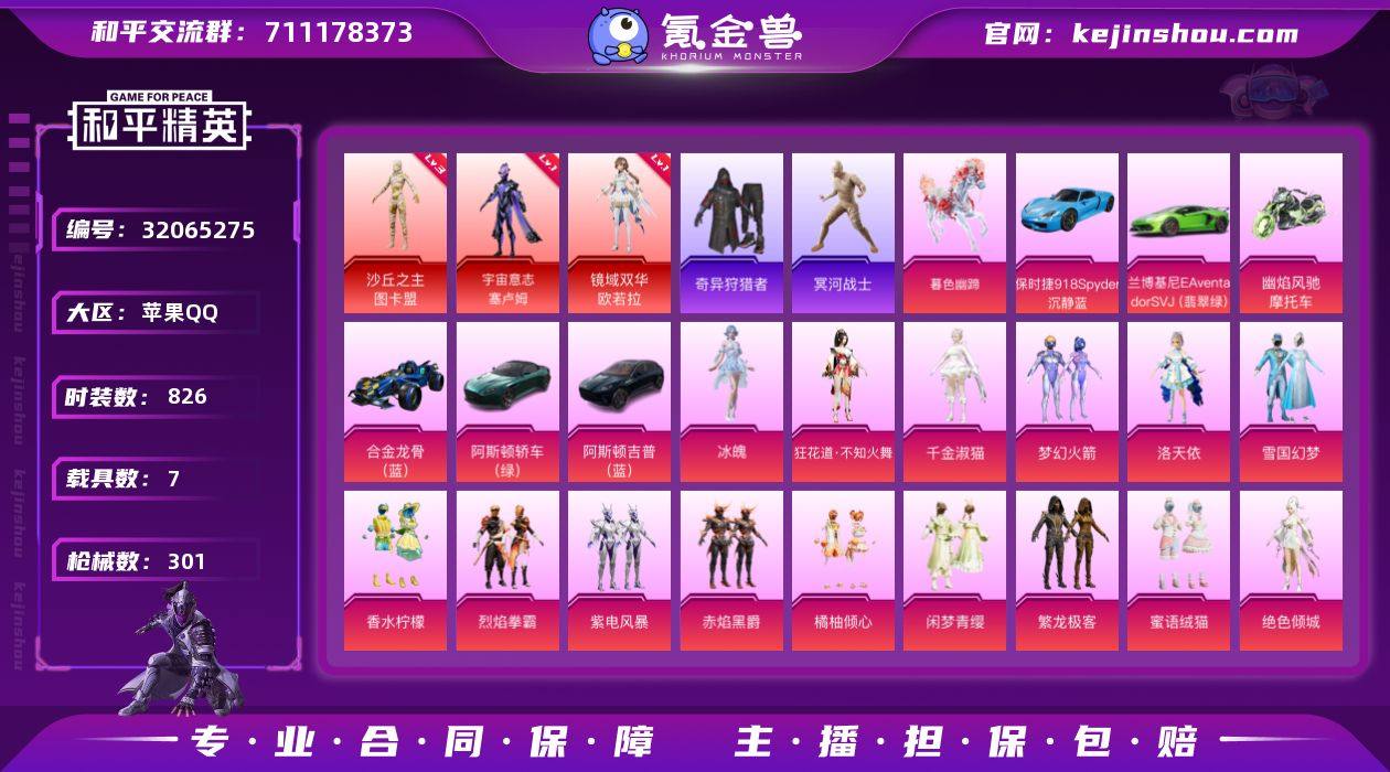 实名: 不可修改 时装数: 826 载具数: 7 枪械数: 301 战备数: 216 神级装扮: 沙丘之主-图卡盟,镜域双华-欧若拉,宇宙意志-塞卢姆 热门装扮: 奇异狩猎者,梦幻火箭(新101),爱崽白熊,香水柠檬,雪国幻梦,烈焰拳霸,冥河战士,洛天依,紫电风暴,赤焰黑爵,橘柚倾心,潮萌小黄鸭,激萌罗小黑,奇迹天团,蔷薇魔法师,闲梦青缨,繁龙极客,蜜语绒猫,绝色倾城,严莉莉,美雪,美琪,小蓝,光极星,狂花道·不知火舞,千金淑猫,冰魄 载具: 阿斯顿·马丁DBS(绿),阿斯顿·马丁DBX(蓝),合金龙骨(蓝),兰博基尼Aventador SVJ(翡翠绿),幽焰风驰摩托车,保时捷918Spyder(沉静蓝),暮色幽蹄 稀有枪皮: MG3洛神天依,M416心之恋语,Groza香水柠檬,SCAR-L机甲封神,M762冷魅冰骑,AWM橘柚倾心,Vector灵感创作师,AUG超新星,P90沙丘之主,SPAS-12蜜语绒猫,M24镜域双华,Mk14精灵梦叶罗丽,M416墨龙九天,AMR鸢尾晶梦,UMP45-宇宙意志,GROZA-精灵之光,DP-28-千金淑猫,Kar98K-巳巳如意,ARX-无垠阁