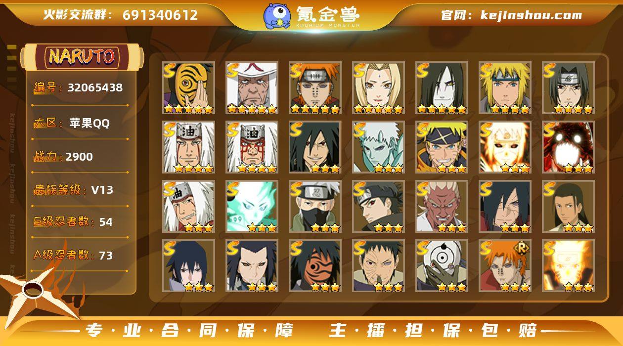 实名: 可修改 贵族等级: V15 区服: 429区 战力值: 24128214 S忍数: 44 A忍数: 75 S级忍者: 宇智波止水「须佐能乎」,艾「忍界大战」,宇智波佐助「永恒万花筒」,大筒木桃式,宇智波斑「秽土转生·解」,千手柱间·木叶创立,神秘面具男 「红夜之刃」,宇智波带土 「忍界大战」,宇智波斑「白面具」,波风水门,漩涡鸣人 「九喇嘛连结」,迈特凯「死门」,千手扉间「秽土转生」,宇智波鼬「秽土转生」,宇智波斑「秽土转生」,宇智波鼬 「须佐能乎」,神秘面具男,千手柱间「秽土转生」,猿飞日斩,千手扉间,波风水门「秽土转生」,千手柱间,宇智波斑,猿飞日斩「秽土转生」,纲手「百豪」,药师兜「仙人模式」,罗砂「四代目风影」,宇智波斑 「木叶创立」,半藏「秽土转生」,无「二代目土影」,长门「秽土转生」,佩恩「天道」,自来也,自来也「仙人模式」,大野木 「忍界大战」,大野木「三代目土影」,艾「四代目雷影」,艾「三代目雷影」,纲手,春野樱 「忍界大战」,大筒木金式「博人传」,自来也 「舞之豪杰」,大蛇丸,旗木卡卡西「须佐能乎」 通灵兽: 忍犬,怒鬼,鵺,砂之守鹤,四尾孙悟空,怒鬼·无臂,怒鬼·爪,二尾又旅,忍龟,鲛鲨,蛤蟆吉,蓝蛇,猿魔,蛞蝓,蛤蟆仙人,镰鼬,山椒鱼,蜃,蛤蟆健,蜘蛛,乌鸦,螃蟹,蛤蟆龙,熊猫,蛤蟆广,一尾守鹤,梦貘,鹰,辛牙 亮点: 高招全有剩余2万金币