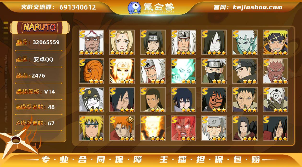 实名:不可二次实名 贵族等级:V13 战力值:29111094 S忍数:54 A忍数:77 五星猿飞日斩,五星自来也「仙人模式」,五星纲手,五星大蛇丸,四星烈斗「初代目风影」,四星波风水门,四星宇智波鼬「须佐能乎」,四星佩恩「天道」,四星自来也,三星漩涡鸣人·宇智波佐助,三星宇智波斑「五影会谈」,三星波风水门「九喇嘛连结」,三星漩涡鸣人「暴怒·第六尾」,三星自来也「传说中的三忍」,三星大筒木舍人「最终章」,三星旗木卡卡西「须佐能乎」,三星宇智波止水「须佐能乎」,三星艾「忍界大战」,三星大筒木桃式,三星宇智波斑「秽土转生·解」,三星千手柱间·木叶创立,三星宇智波佐助「永恒万花筒」,三星三代目风影「秽土转生」,三星神秘面具男「红夜之刃」,三星宇智波带土「忍界大战」,三星宇智波斑「白面具」,三星佩恩·天道「超」,三星漩涡鸣人「九喇嘛连结」,三星迈特凯「死门」,三星千手扉间「秽土转生」,三星宇智波鼬「秽土转生」,三星宇智波斑「秽土转生」,三星神秘面具男,三星千手柱间「秽土转生」,三星千手扉间,三星波风水门「秽土转生」,三星千手柱间,三星宇智波斑,三星猿飞日斩「秽土转生」,三星纲手「百豪」,三星药师兜「仙人模式」,三星罗砂「四代目风影」,三星宇智波斑「木叶创立」,三星半藏「秽土转生」,三星无「二代目土影」,三星长门「秽土转生」,三星鬼灯幻月「二代目水影」,三星大野木「忍界大战」,三星大野木「三代目土影」,三星艾「四代目雷影」,三星艾「三代目雷影」,三星春野樱「忍界大战」,三星大筒木金式「博人传」,三星自来也「舞之豪杰」 五星飞段「死司凭血」,五星飞段,五星蝎,五星干柿鬼鲛,五星猿飞阿斯玛,五星迈特凯,四星我爱罗「疾风传」,三星蝎「绯流琥」,三星漩涡博人「桃式显现」,三星宇智波止水,三星长门「青年」,三星艾「青年」,三星达鲁伊「五代目雷影」,三星波风水门「青年」,三星药师兜「半蛇斗篷」,三星小南,三星迪达拉,三星宇智波鼬,二星旗木卡卡西「神威对决」,二星小南「神驹佑将」,二星迈特凯「青春爆炸」,二星纲手「妖怪奇谭」,二星巳月「仙人模式」,二星大野木「侠隐江湖」,二星机械鸣人「初始形态」,二星土台「忍界大战」,二星黑土「夏日限定」,二星桃地再不斩「秽土转生」,二星神农「羁绊」,二星宇智波带土「漂泊浪客」,二星宇智波泉奈,二星不动,二星黑绝,二星角都「秽土转生」,二星李洛克「忍界大战」,二星旗木卡卡西「幻之真容」,二星日向雏田「最终章」,二星宇智波鼬「夏日限定」,二星小南「漂泊浪客」,二星日向宁次·忍界大战,二星不缘,二星长十郎「六代目水影」,二星不风,二星旗木卡卡西「元气夏日」,二星千手扉间「漂泊武士」,二星奇拉比「忍界大战」,二星宇智波止水「新春限定」,二星黑土「博人传」,二星宇智波佐助「须佐能乎」,二星加藤断,二星迪达拉「秽土转生」,二星小南「新春限定」,二星旗木卡卡西「忍界大战」,二星猿飞木叶丸「博人传」,二星照美冥「夏日泳装」,二星漩涡鸣人「九尾查克拉」,二星角都「晓创生」,二星千代「近松十人卫」,二星宇智波鼬「新春限定」,二星我爱罗「忍界大战」,二星秋道丁次「忍界大战」,二星大蛇丸「晓」,二星猿飞阿斯玛「秽土转生」,二星春野樱「百豪」,二星波风水门「新春限定」,二星照美冥「五代目水影」,二星勘九郎「忍界大战」,二星猿飞日斩「火影继承人」,二星宇智波佐助「万花筒写轮眼」,二星志村团藏,二星奇拉比,二星漩涡鸣人「仙人模式」,二星旗木卡卡西「万花筒写轮眼」,二星角都「地怨虞」,二星角都,二星桃地再不斩,二星卑留呼「火之意志继承者」 卖家说:全高招S A,