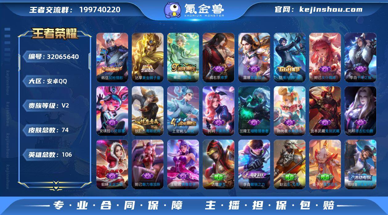 安卓Q-永恒钻石III-106英雄-74皮肤-1典藏-2传说-21史诗 【典藏皮肤】 弑枪猎影 【传说皮肤】 鸣野蒿 黄金狮子座 【史诗皮肤】 布丁狗之约 谧流熔炉 灵蛊蚀心 龙之律动 踏浪烽翎 百相守梦 织梦人 女仆咖啡 魅力维加斯 鹰眼统帅 圣诞恋歌 鬼剑武藏 修罗 曙光守护者 暗隐猎兽者 千年之狐 德古拉伯爵 紫霞仙子 梁祝 水果甜心 偶像歌手 节奏热浪 心灵骇客 【勇者皮肤】 敬我三分 雾都夜雨 天穹祈灯 星梦巡礼 铁骨偃魂 苍林狼骑 群星魔术团 噬灭天穹 天穹之誓 剑破天穹 熔金海岸 龙舞盛年 灵野札记 春野闲踪 春野闲踪 虚灵犬护 浪漫序章 雪境奇遇 玫蓝誓约 归虚梦演 克喵 谧流熔炉 未来纪元 万象初新 兔女郎 敏锐之力 红桃皇后 死亡骑士 忍·炎影 花好人间 潮玩探月行 蔚蓝守将 玩偶对对碰 白色死神 拳王 少女阿狸 阴阳师 黄金武士 【稀有英雄】 不知火舞 橘右京 夏洛特 娜可露露 韩信 艾琳 赵云 营地ID:1681626807