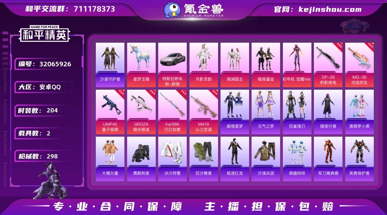 M1046442【身法号2载具-4粉装-6特效枪星梦玉骢 沙漠守护者黑丝 觉醒紫螳螂 心之恋语7级 激萌罗小黑 浪漫天命 狂沙舞者 猫包】安卓手Q-2载具-4粉装-6特效枪-204套装-298枪皮-12王牌印记-坚韧铂金Ⅱ-85680热力值【2载具】特斯拉Roadster(沁心粉) 星梦玉骢【4粉装】暗夜鎏金 角色-月影灵韵 海渊国主 角色-初号机 觉醒Ver.【6特效枪】UMP45-量子极限[5级] Kar98K-巳巳如意[5级] M416-心之恋语[7级] MG-36-沧焰双生[5级] DP-28-豹影疾电[5级] GROZA-镜光银凌[5级]【4稀有】激萌罗小黑 浪漫天命 狂沙舞者 AKM-百万伏特【11飞行器】狂鲨锋刃飞行器 太空嘟嘟飞行器 登顶巅峰飞行器 空岛之星尾迹 鸡智如我飞行器 异域银装飞行器 动力核心飞行器 马上有福飞行器 天之羽翼飞行器 炫彩糖果飞行器 焰龙焚天飞行器【1头盔】百万伏特头盔【2背包】古堡领主背包 百万伏特背包【488其它衣服和枪皮】擎苍青焰 SS16特训 特训学院 爆裂葡萄 霓虹极客 千禧之恋 SS19特训 极地朋克 青年教官 炫彩糖果 云魄琉璃 薄荷星砂 探宝勇士 灰色格斗者 SS24特训 灼焰舞者 春日漫步 暗夜契约 角色-Mark.06 午间小调 云霞荷露 风迹短诗 糖果砰砰 光之冒险 智慧之神 众神之王 都市魅力 SS17特训 SS28特训 燃烧卡路里 白熊同盟 蓝彩潮人 冰暴轰轰 猎鹰 风行保卫者 云朵鹅 坚韧舞者 热血青春 惊鸿侠骨 画境星梦 SS21特训 白月香洋装 妙红点点 雪山精英 橘黑制服 智谋强哥 福星高照 萌趣咩咩 蓝色运动 黑夜传说 纯真浪花 SS3特训 狂鲨锋刃 浪漫假日 角色-极地流光 机械征服者 凌霄紫焰 滨海厨神 海上生明月 秘语星愿 SS27特训 琴音绮想 神秘领域 蓝海鲸歌 特种颜团子 热情海星 SS14特训 SS32特训 缤纷假日 沙漠守护者 王牌教练 破蛋小黄鸡 SS35特训 SS33特训 野性战魂 战地督导 青玉碎影 角色-听雨铃兰 活力之心 神气柴柴 龟仙人 萌黄之夏