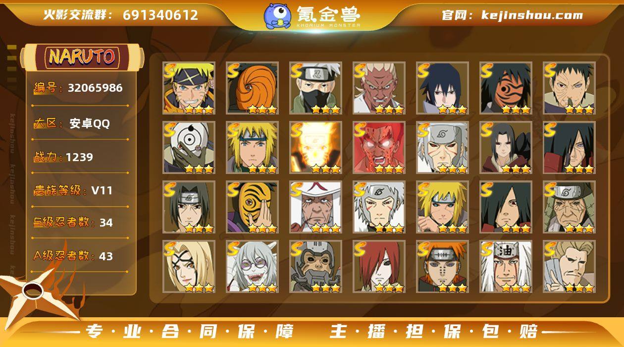 【性价比多忍者号】y6798 v11 战力1239w 34s 43a 熊猫 1183金币 500点券 3个198a 传说自来也60片 十尾带土81片 金角62片 忍战大野木96片 福袋金币3500 25档忍法帖已开