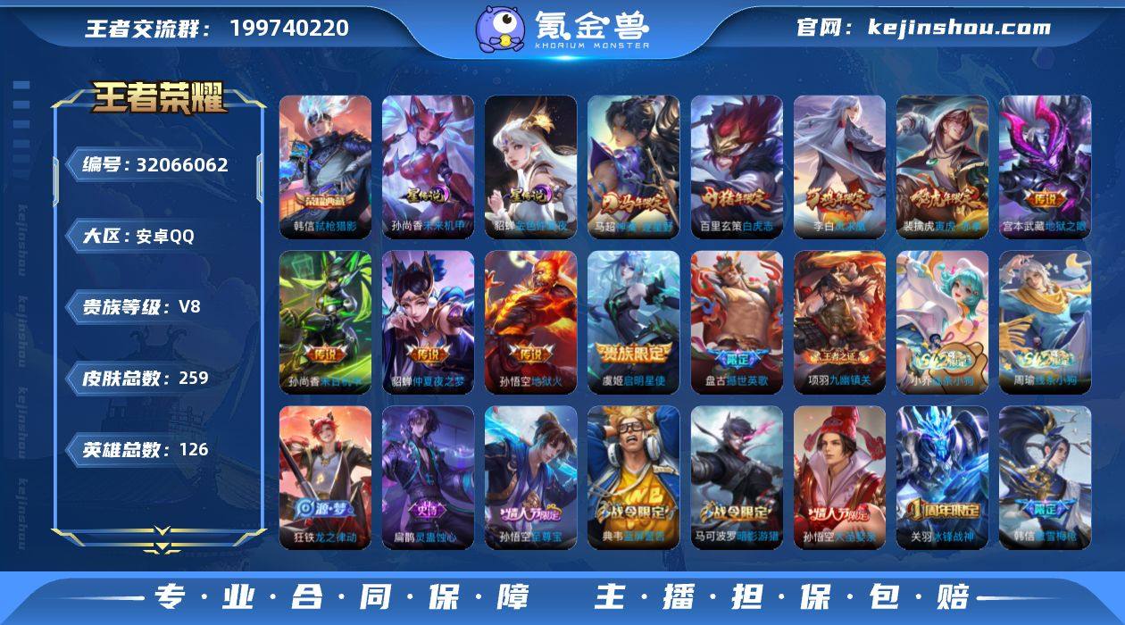 ky 可认证 安卓(q)区 259皮 1典藏 9传说 81限定 12王者印记 2星 亮点推荐:【弑枪猎影 神骥·逐星野 寅虎·赤拳 凤求凰 白虎志 仲夏夜之梦】道具内容:5按键