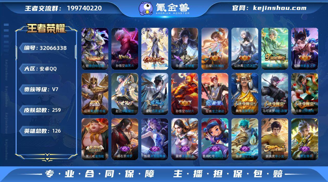 安卓Q-V7-至尊星耀V段位-126英雄-259皮肤-1典藏-0珍品无双-0无双-0珍品传说-10传说-69史诗 【英雄全皮】:鬼谷子全皮 【荣耀典藏】:铠银白咏叹调 【传说皮肤】:司空震愿照山河定,云缨幻光神枪,桑启鸣野蒿,公孙离记忆之芯,赵云淬星耀世,李信一念神魔,虞姬云霓雀翎,后羿黄金射手座,貂蝉仲夏夜之梦,孙悟空地狱火 【限定皮肤】:白起狰,姜子牙天穹之誓,狄仁杰阴阳师,赵云皇家上将,墨子神迹守卫,嬴政优雅恋人,嬴政白昼王子,鲁班七号狮舞东方,芈月重明,吕布猎兽之王,元歌云间偶戏,夏侯惇朔风刀,曹操烛龙,典韦穷奇,典韦蓝屏警告,马可波罗暗影游猎,狄仁杰魔术师,狄仁杰万华元夜,达摩沙漠行僧,项羽海滩派对,老夫子醍醐杖,老夫子航海奇遇记,程咬金演武夺筹,韩信逐梦之影,兰陵王金庭之子,亚瑟潮玩骑士王,牛魔御旌,李元芳银河之约,李元芳云中旅人,钟馗神迹守卫,钟馗驱傩正仪,杨玉环遇见飞天,女娲朔望之晖,蔡文姬繁星吟游,太乙真人饕餮,鬼谷子原初探秘者,鬼谷子五谷丰年,苏烈千军破阵,百里玄策原初追逐者,弈星混沌棋,沈梦溪星空之诺,沈梦溪大漠名商,明世隐疑决卦,裴擒虎李小龙,裴擒虎擒涛扼浪,狂铁御狮,米莱狄御霄,云中君纤云弄巧,盾山御銮,猪八戒西部大镖客,猪八戒猪悟能,上官婉儿梁祝,嫦娥拒霜思,嫦娥暖冬兔眠,西施玲珑珍味,鲁班大师探海日志,桑启海盐诗旅,戈娅驭风魔法,张良古海寻踪,鬼谷子天穹祈灯,沈梦溪龙舞盛年,项羽苍威无极 【赛季限定】:白起狰,芈月重明,夏侯惇朔风刀,曹操烛龙,典韦穷奇,狄仁杰万华元夜,达摩沙漠行僧,老夫子醍醐杖,程咬金演武夺筹,兰陵王金庭之子,张良古海寻踪,牛魔御旌,李元芳云中旅人,钟馗驱傩正仪,太乙真人饕餮,鬼谷子原初探秘者,苏烈千军破阵,百里玄策原初追逐者,弈星混沌棋,沈梦溪大漠名商,明世...