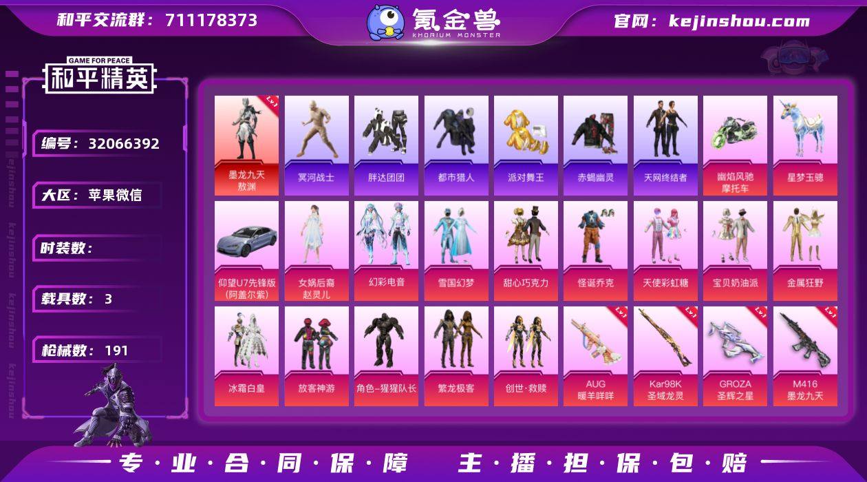 YZJ9932 可二次 苹果V-69677热力值【极品身法素材衣柜号 地铁满天赋 银粉丝logo SS32无敌战神框 M4墨龙 敖渊 新版三色螳螂 木乃伊 雪国 小丑[怪诞] 都市 赤蝎 金鞋 天网 黑丝ROCK长袖T恤 赵灵儿 巧克力三姐妹 发光眼罩 六号稻草人 六号熟人 鹿角斗士 青蛙服 艾伦沃克 2B小姐姐 4AM追光队服 JDE战队服 龙宝僚机 国宝头粉熊包 3款计数枪 1红装3载1僚机14粉18枪】 9王牌印记 历史无敌战神 126套装 191枪皮 【4载具】 仰望U7先锋版(阿盖尔紫) 星梦玉骢 幽焰风驰摩托车 圣域龙宝僚机【1神装】 墨龙九天-敖渊 (1级) 【8稀有】 木乃伊 赤蝎幽灵 AKM-缤纷海域 都市猎人 浪漫天命 派对舞王 天网终结者 派对舞王(金靴子) 【14粉装】 觉醒初号机 雪国幻梦 赵灵儿 宝贝奶油派 天使彩虹糖 甜心巧克力 猩猩队长 怪诞乔克 创世救赎 金属狂野 幻彩电音 放客神游 繁龙极客 冰霜白皇 【18特效枪】 SCAR-L-锦绣绵绵 (5级) M416-心之恋语 (5级) M416-墨龙九天 (3级) AKM-幽焰骑士 (3级) AKS-74U-信仰神谕 (4级) AKM-绿萝繁花 (5级) Kar98K-圣域龙灵 (1级) Kar98K-巳巳如意 (5级) M762-甜蜜誓约 (3级) M762-青锋波束 (5级) AUG-暖羊咩咩 (5级) P90-能量风暴 (5级) UMP45-量子极限 (5级) GROZA-圣辉之星 (4级) GROZA-镜光银凌 (5级) UZI-绮梦青鸾 (5级) 破片手榴弹-秋玉花灯 (5级) 烟雾弹-甜梦果泡 (4级) 【3飞行器】 龙翔九天飞行器 齐天大圣飞行器 深渊漩涡飞行器 【15热门】 8号机 Mark.06 龟仙人 2B战斗服款 六号稻草人 雪山精英 六号树人 鹰眼刺客 胖达团团 4AM追光队服 JDE战队服 暗夜契约 纯白誓言 狂沙舞者 漫步者 【3头盔】 雪国精灵头盔 甜心宝贝头盔 甜蜜誓约头盔 【4背包】 雪国精灵背包 甜心宝贝背包 萌熊伴侣背包 甜蜜誓约背包 营地ID:926385604