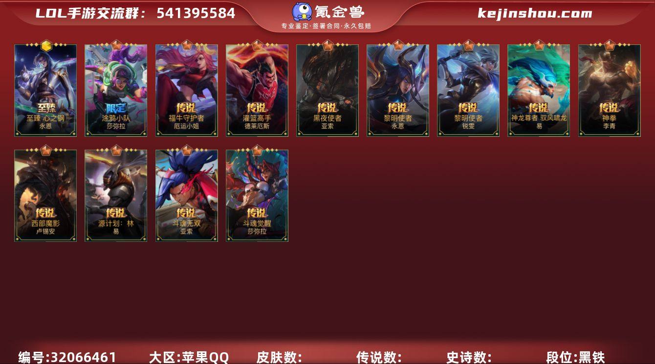 [17351245]1神话 1限定 12传说 57史诗 138皮肤 可二次 可修改实名 【段位】铂金 【神话皮】至臻心之钢永恩 【限定皮肤】涂鸦小队莎弥拉 【传说皮】斗魂觉醒 莎弥拉,西部魔影卢锡安,神拳盲僧,神龙尊者 驭风啸龙,黎明使者锐雯,黑夜使者亚索,灌篮高手,福牛守护者女枪,斗魂无双亚索,源计划:林,黎明使者永恩,涂鸦小队莎弥拉