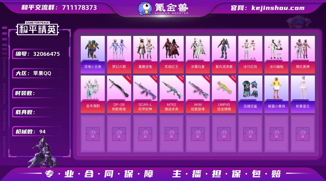 YZJ11599-可二次-不可转区-苹果Q-9粉装5特效枪5热门73套装94枪皮 34665热力值 精品女号 梦幻火箭 童趣迷兔 冰川二姐妹 金丰海韵 冰霜白皇 深海小丑鱼 鲨鱼服 童趣迷兔头盔 6级斯嘎机甲封神 5级AK炫紫旋律 4级M762激战未来 4级UMP45恐龙拽拽 4印记 历史超级王牌10星 【9粉装】 梦幻火箭 金丰海韵 冰川幽秘 童趣迷兔 冰霜白皇 炙焰红王 银红美神 冰川红玫 复仇流浪者 【5特效枪】 AKM-炫紫旋律 (5级) DP-28-豹影疾电 (3级) M762-激战未来 (4级) SCAR-L-机甲封神 (6级) UMP45-恐龙拽拽 (4级) 【5热门】 迅捷狂鲨 深海小丑鱼 破蛋小黄鸡 英勇保护者 Kar98K-深海曼妙 【1飞行器】 梦幻火箭飞行器 【1头盔】 梦幻火箭头盔 【1背包】 梦幻火箭背包 营地ID:761539356