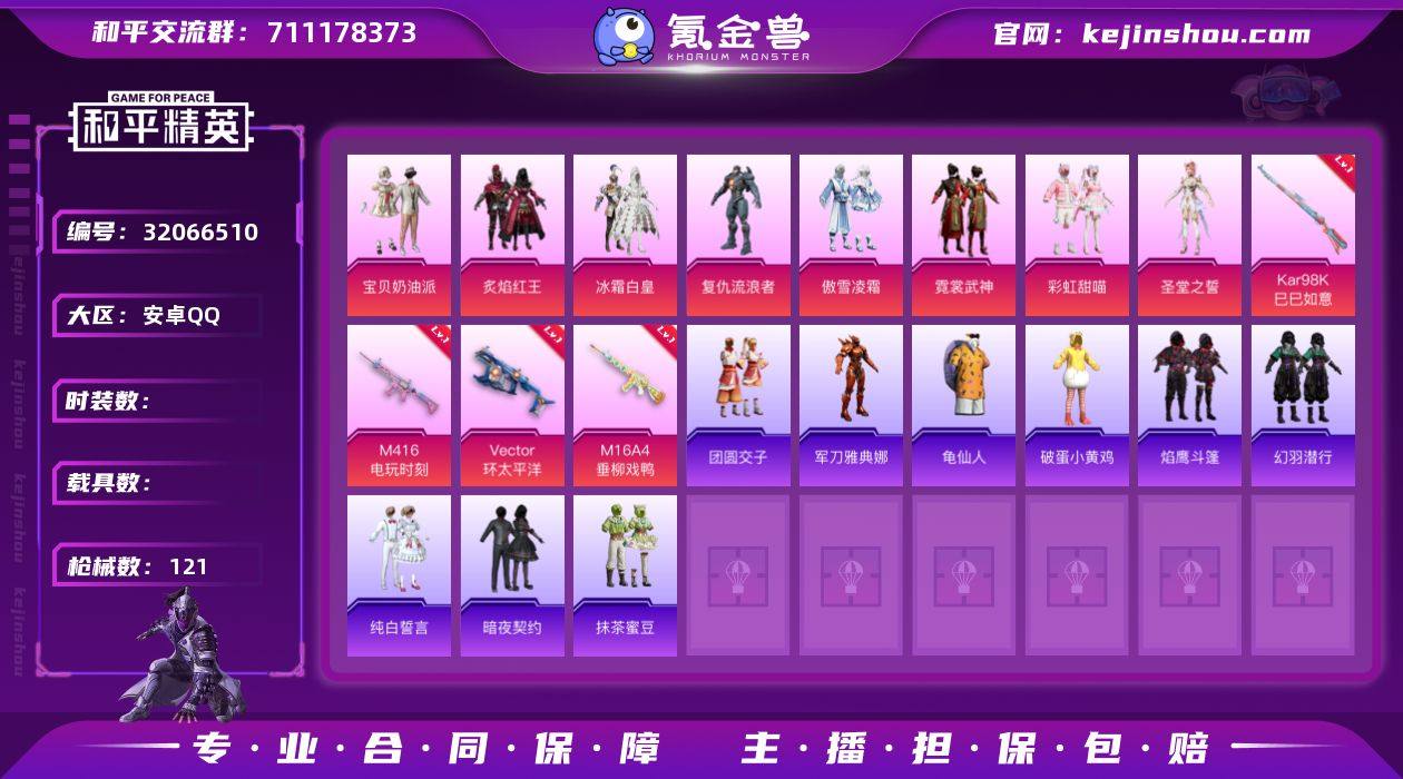 YZJ11544 可二次 安卓Q-8粉装4特效枪9热门 精品小号 奶油派 彩虹甜喵 流浪者 雅典娜 100套装121枪皮 40239热力值 6印记 历史卓越王牌5星 【8粉装】 圣堂之誓 宝贝奶油派 霓裳武神 冰霜白皇 炙焰红王 傲雪凌霜 彩虹甜喵 复仇流浪者 【4特效枪】 M416-电玩时刻 (5级) Kar98K-巳巳如意 (5级) M16A4-垂柳戏鸭 (4级) Vector-环太平洋 (5级) 【9热门】 龟仙人 暗夜契约 团圆交子 纯白誓言 抹茶蜜豆 破蛋小黄鸡 极速红龙 军刀雅典娜 英勇保护者 【1飞行器】 绒雪飘舞飞行器 【2头盔】 甜心宝贝头盔 夏日绵绵冰头盔 【1背包】 夏日绵绵冰背包 营地ID:959399630