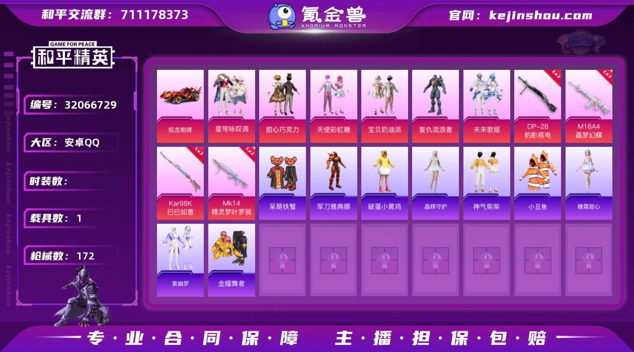 YZJ11750-可二次-安卓Q-1载具7粉装4特效枪9热门107套装172枪皮 49611热力值 9印记 历史超级王牌15星 精品公主号 巧克力三姐妹 未来歌姬 4满级常用不重复特效抢 蕾丝眼罩 破蛋小黄鸡 小丑鱼 白辉玉蕊 【1载具】 焰龙咆哮 【7粉装】 宝贝奶油派 天使彩虹糖 甜心巧克力 异瞳寒姬 未来歌姬 星穹咏叹调 复仇流浪者 【4特效枪】 Kar98K-巳巳如意 (5级) DP-28-豹影疾电 (5级) Mk14-精灵梦叶罗丽 (7级) M16A4-晶梦幻蝶 (7级) 【9热门】 小丑鱼 晶辉守护 呆萌铁蟹 破蛋小黄鸡 军刀雅典娜 英勇保护者 M762-奇异狩猎者 M24-奇异狩猎者 S686-奇异狩猎者 【1头盔】 甜心宝贝头盔 【2背包】 甜心宝贝背包 放客神游背包 营地ID:778220113