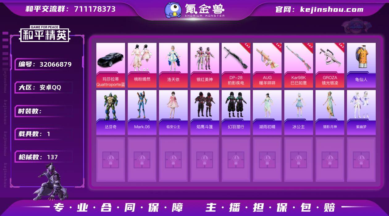 YZJ12987 可二次 安卓Q-1载具3粉装5特效枪3热门 精品小号 洛天依 蓝螳螂 aug暖羊咩咩满级 70套装137枪皮 35069热力值 历史荣耀皇冠Ⅱ 【1载具】 玛莎拉蒂Q蓝色 【3粉装】 洛天依 桃粉嫣然 银红美神 【5特效枪】 Kar98K-巳巳如意 (5级) M762-青锋波束 (5级) DP-28-豹影疾电 (5级) AUG-暖羊咩咩 (5级) GROZA-镜光银凌 (5级) 【3热门】 Mark.06 龟仙人 Vector-风花雪月 【1背包】 百万伏特背包 营地ID:934042958