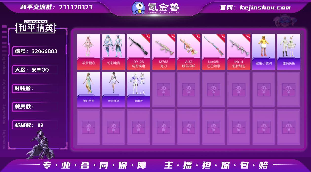 YZJ13048 可二次 安卓Q-3粉装5特效枪2热门50套装89枪皮 【小女号 羊梦 史莱姆 香桃花海 密露汐语 猎影月神 LGD战队服】 24371热力值 2印记 历史卓越王牌4星 【3粉装】 羊梦糖心 幻星舰长 幻彩电音 【5特效枪】 Kar98K-巳巳如意 (5级) M762-鬼刀 (5级) DP-28-豹影疾电 (5级) AUG-暖羊咩咩 (5级) Mk14-甜梦熊击 (5级) 【2热门】 LGD战队服 破蛋小黄鸡 营地ID:976798516