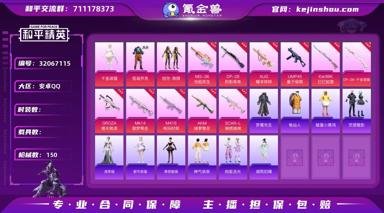 YZJ13155 可二次 安卓Q-3粉装13特效枪3热门 极品身法小号 带地铁 绝世1 小丑 千金淑猫 多款不重复特效满级特效 m4电玩满级 aug暖羊满级 89套装150枪皮 42954热力值 14印记 历史绝世王牌16星 【3粉装】 千金淑猫 怪诞乔克 创世救赎 【13特效枪】 SCAR-L-锦绣绵绵 (5级) M416-电玩时刻 (5级) AKM-绿萝繁花 (5级) Kar98K-巳巳如意 (5级) M762-青锋波束 (5级) MG-36-沧焰双生 (5级) DP-28-千金淑猫 (6级) DP-28-豹影疾电 (5级) AUG-暖羊咩咩 (5级) UMP45-量子极限 (5级) Mk14-甜梦熊击 (5级) GROZA-镜光银凌 (5级) 汤姆逊-热量炸弹 (5级) 【3热门】 龟仙人 梦魇先生 破蛋小黄鸡 【1飞行器】 黄族统领飞行器 【1背包】 金风玉露背包 营地ID:932081469
