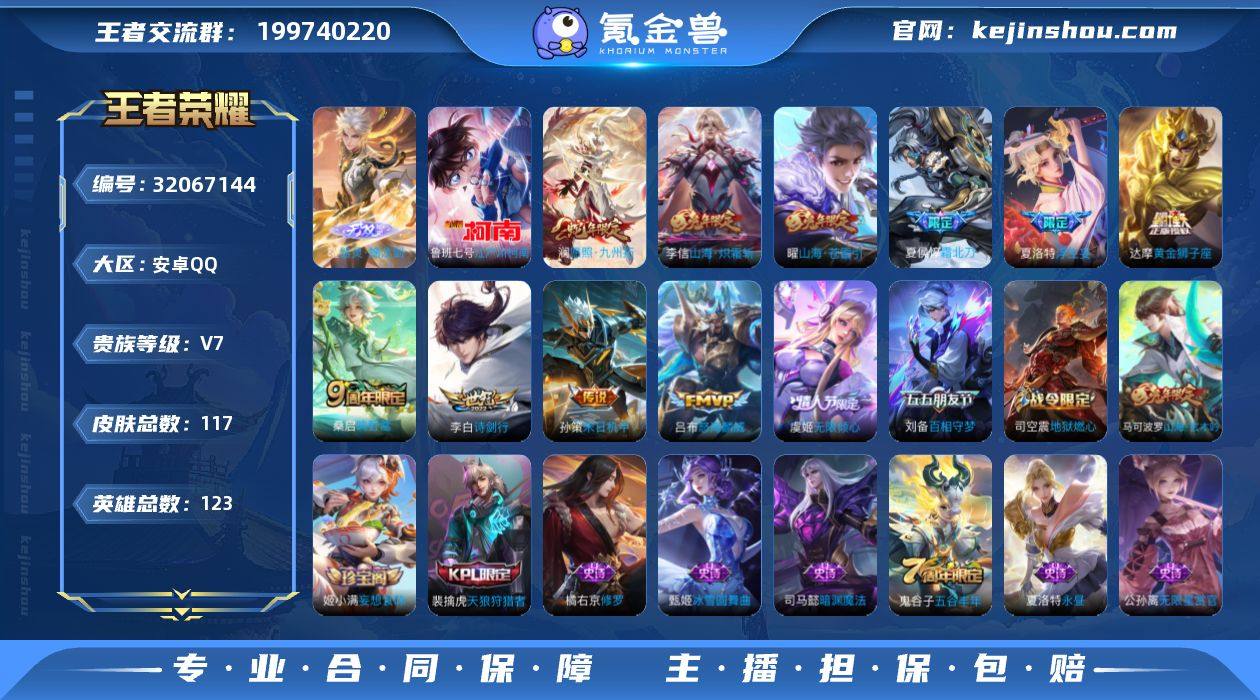 【高性价比·全皮夏洛特·器灵螭龙剑·江户川柯南·霜北刀·浮生妄·虞姬无限倾心·山海苍雷引·山海炽霜斩·怒海麟威·诗剑行·美猴王·山海玄木吟·可二次】YXw17870-安卓Q-123英雄-117皮肤-4王者印记-140铭文-贵族积分3w【贵族7】【1无双·1珍品·11传说·7按键·201幸运值】【因赛季更新游戏段付以上号为准!】 【英雄全皮】:夏洛特全皮 【无双皮肤】:曜器灵螭龙剑 【珍品传说】:鲁班七号江户川柯南 【传说皮肤】:澜愿照九州拓,桑启鸣野蒿,夏侯惇霜北刀,夏洛特浮生妄,虞姬无限倾心,曜山海苍雷引,李信山海炽霜斩,吕布怒海麟威,李白诗剑行,孙策末日机甲,达摩黄金狮子座 【限定皮肤】:夏侯惇霜北刀,姜子牙天穹之誓,狄仁杰阴阳师,赵云皇家上将,扁鹊奇幻香踪,马可波罗山海玄木吟,狄仁杰魔术师,项羽海滩派对,兰陵王金庭之子,孙悟空美猴王,刘备百相守梦,李元芳云中旅人,虞姬无限倾心,杨戬潮玩骑兵,鬼谷子五谷丰年,沈梦溪大漠名商,裴擒虎天狼狩猎者,裴擒虎擒涛扼浪,云中君纤云弄巧,李信山海炽霜斩,嫦娥拒霜思,嫦娥暖冬兔眠,曜山海苍雷引,鲁班大师探海日志,桑启海盐诗旅,夏洛特浮生妄,暃星界游侠,艾琳流音漫舞,司空震地狱燃心,阿古朵江河有灵,张良古海寻踪,蒙犽百解令,高渐离燃音魔法,妲己灵卜魔法,鬼谷子天穹祈灯,姬小满妄想食味,刘邦剑破天穹,程咬金群星魔术团,周瑜熔金海岸 【年限皮肤】:孙悟空美猴王,曜山海苍雷引,李信山海炽霜斩,马可波罗山海玄木吟,澜愿照九州拓 【赛季限定】:兰陵王金庭之子,沈梦溪大漠名商,李元芳云中旅人,桑启海盐诗旅,裴擒虎擒涛扼浪,鲁班大师探海日志,张良古海寻踪,鬼谷子天穹祈灯,刘邦剑破天穹,姜子牙天穹之誓,太乙真人谧流熔炉 【战令限定】:暃星界游侠,嫦娥暖冬兔眠,扁鹊奇幻香踪,杨戬潮玩骑兵,司空震地狱燃心,艾琳流音漫舞,...