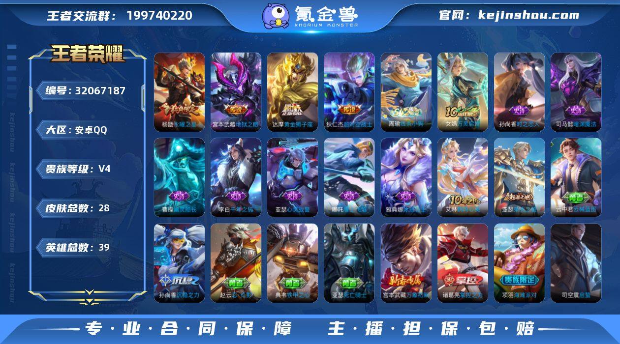 【精品小号·永曜之星·可二次】YXw17883-安卓Q-39英雄-28皮肤-0王者印记-40铭文-贵族积分0w【贵族4】【4传说】【因赛季更新游戏段付以上号为准!】 【传说皮肤】:达摩黄金狮子座,杨戬永曜之星,宫本武藏地狱之眼,狄仁杰超时空战士 【限定皮肤】:项羽海滩派对,杨戬永曜之星 【年限皮肤】:杨戬永曜之星 【赛季限定】:亚瑟荣光之誓 【战令限定】:周瑜线条小狗 【史诗皮肤】:周瑜线条小狗,女娲万灵启世,哪吒雪上飞焰,司马懿暗渊魔法,孙尚香时之恋人,雅典娜冰冠公主,亚瑟心灵战警,李白千年之狐,曹操幽灵船长 【其他皮肤】:艾琳鹤鸣心笺,亚瑟荣光之誓,云中君云械蓝图,典韦铁甲之心,诸葛亮掌控之力,孙尚香沉稳之力,宫本武藏万象初新,亚瑟死亡骑士,赵云忍炎影,项羽海滩派对,暃碧珀绯影,司空震启蛰,元歌午夜歌剧院,铠龙域领主,露娜绯红之刃
