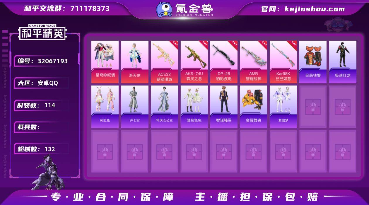 DYH18021+安卓手Q-2粉装-6特效枪-114套装-132枪皮-9王牌印记-超级王牌5星-39418热力值【2粉装】角色-洛天依,星穹咏叹调【6特效枪】Mk14-福马献瑞[5级],DP-28-豹影疾电[5级],ACE32-萌骑漫游[2级],AMR-智耀战神[7级],Kar98K-巳巳如意[5级],AKS-74U-森灵之息[5级]【1稀有】AKM-奇异狩猎者【9飞行器】牡丹亭・游园飞行器,动力核心飞行器,顶峰精英尾迹,破刃行动尾迹,狂鲨锋刃飞行器,时光之誓飞行器,异域银装飞行器,马上有福飞行器,时光之吻飞行器【237其它衣服和枪皮】人气偶像,星途旅人,星影赞美诗,长空猛禽,凌霄紫焰,湖蓝色名流,青年教官,都市魅力,滨海厨神,云魄琉璃,黄色伏地魔,黑色伏地魔,玩偶服-懒羊羊,顶瓜瓜,SS34特训,缤纷果语,蝶变,破晓战魂,角色-蜜桃派对,幻影武者,街头潮人,擎苍青焰,棋盘冕主,紫幽梦,特训学院,马上有钱,灼焰舞者,雏菊兔兔,战术大师,旭日情侣,雨过天青,SS37特训,特战装甲,猛禽,萝兰蝴蝶,黄色名流,白糯汤圆,粉恋花,云朵鹅,战地督导,玩偶服-美羊羊,猎鹰,橘黑制服,街头风暴,深蓝色名流,鱼渊荷华,薄荷星砂,SS36特训,森林游猎者,SS32特训,青翼流星,幻世战舞者,白色伏地魔,竞技达人朋克,小熊娃娃,SS35特训,潮流炫酷,福马献瑞,极速红龙,蓝彩潮人,粉黛兰香,红釉青花,异域银装,酒红色名流,雪绒豹,冰冻风暴,龙魂突击队,香桃花海,元气之梦,雪国风尚,蓝色运动,SS33特训,棉花软糖,蓝冰羽,SS30特训,冷焰舞者,完美偶像,狙击之神,角色-许七安,巳巳如意,智谋强哥,霓虹热舞,竞技名士,红色运动,狂鲨锋刃,彩虹兔,画境星梦,海岛探路者,耀粉歌者,燕燕于飞,柠萌假日,冰河战士,金耀舞者,琴音绮想,呆萌铁蟹,大橘大利,绮丽涂鸦,角色-霜刃之御,糖糖葫芦,魅力单车,SS31特训,角色-怀庆长公主,书海巡游,角色-魔药课室,朱霞炽焰,元素星魂,青团波波,黄色运动,恋语绒绒,萌鸡速递,角色-狂花道·雅典娜,SS29特训,UMP45-海盐豹豹,野...