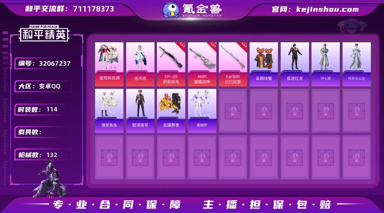 DYH18021+安卓手Q-2粉装-6特效枪-114套装-132枪皮-9王牌印记-超级王牌5星-39418热力值【2粉装】角色-洛天依,星穹咏叹调【6特效枪】Mk14-福马献瑞[5级],DP-28-豹影疾电[5级],ACE32-萌骑漫游[2级],AMR-智耀战神[7级],Kar98K-巳巳如意[5级],AKS-74U-森灵之息[5级]【1稀有】AKM-奇异狩猎者【9飞行器】牡丹亭・游园飞行器,动力核心飞行器,顶峰精英尾迹,破刃行动尾迹,狂鲨锋刃飞行器,时光之誓飞行器,异域银装飞行器,马上有福飞行器,时光之吻飞行器【237其它衣服和枪皮】人气偶像,星途旅人,星影赞美诗,长空猛禽,凌霄紫焰,湖蓝色名流,青年教官,都市魅力,滨海厨神,云魄琉璃,黄色伏地魔,黑色伏地魔,玩偶服-懒羊羊,顶瓜瓜,SS34特训,缤纷果语,蝶变,破晓战魂,角色-蜜桃派对,幻影武者,街头潮人,擎苍青焰,棋盘冕主,紫幽梦,特训学院,马上有钱,灼焰舞者,雏菊兔兔,战术大师,旭日情侣,雨过天青,SS37特训,特战装甲,猛禽,萝兰蝴蝶,黄色名流,白糯汤圆,粉恋花,云朵鹅,战地督导,玩偶服-美羊羊,猎鹰,橘黑制服,街头风暴,深蓝色名流,鱼渊荷华,薄荷星砂,SS36特训,森林游猎者,SS32特训,青翼流星,幻世战舞者,白色伏地魔,竞技达人朋克,小熊娃娃,SS35特训,潮流炫酷,福马献瑞,极速红龙,蓝彩潮人,粉黛兰香,红釉青花,异域银装,酒红色名流,雪绒豹,冰冻风暴,龙魂突击队,香桃花海,元气之梦,雪国风尚,蓝色运动,SS33特训,棉花软糖,蓝冰羽,SS30特训,冷焰舞者,完美偶像,狙击之神,角色-许七安,巳巳如意,智谋强哥,霓虹热舞,竞技名士,红色运动,狂鲨锋刃,彩虹兔,画境星梦,海岛探路者,耀粉歌者,燕燕于飞,柠萌假日,冰河战士,金耀舞者,琴音绮想,呆萌铁蟹,大橘大利,绮丽涂鸦,角色-霜刃之御,糖糖葫芦,魅力单车,SS31特训,角色-怀庆长公主,书海巡游,角色-魔药课室,朱霞炽焰,元素星魂,青团波波,黄色运动,恋语绒绒,萌鸡速递,角色-狂花道·雅典娜,SS29特训,UMP45-海盐豹豹,野...