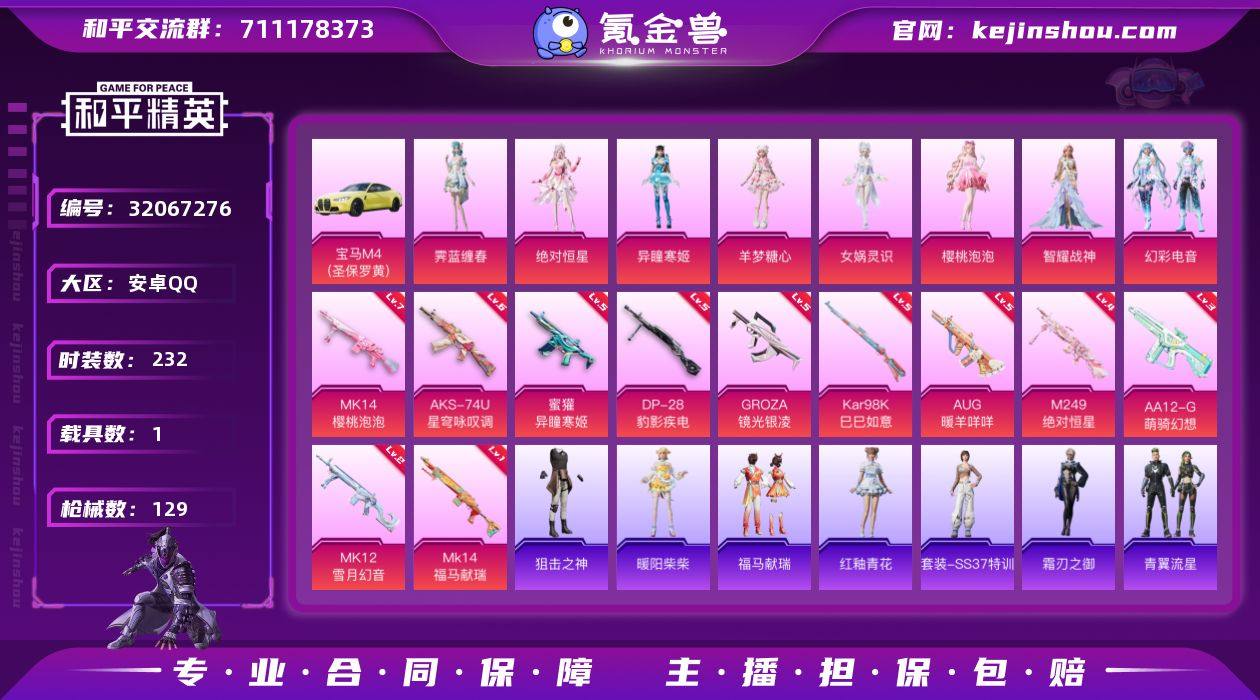 tx 萌妹入坑首选! 穿搭非常艳丽! 【40612热力值】【6王牌】【8粉装11特效枪1载具】 【载具】宝马M4(圣保罗黄) 【粉装】霁蓝缠春,羊梦糖心,樱桃泡泡,女娲灵识,绝对恒星 【特效枪】六级AKS-74U-星穹咏叹调,五级AUG-暖羊咩咩,五级Kar98K-巳巳如意,五级GROZA-镜光银凌,二级MK12-雪月幻音,五级DP-28-豹影疾电,五级蜜獾-异瞳寒姬