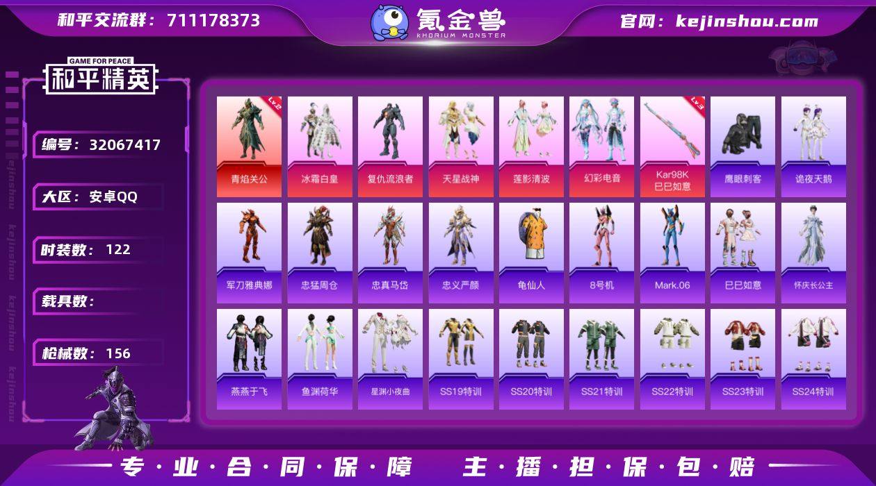 【ashp6】安卓,手Q-1神装-5粉装-1特效枪-0载具-3粉色飞行器-49297热力值-6王牌印记-122套装-156枪皮 【红色神装等级】:角色-青焰关公(二级) 【红色角色神装】:角色-青焰关公 【热门品类】:角色-军刀雅典娜,角色-忠猛周仓,角色-忠真马岱,角色-忠义严颜,套装-龟仙人,角色-8号机,角色-Mark.06,大砍刀-青龙偃月刀,撬棍-龙胆亮银枪 【粉色套装】:粉装-冰霜白皇,角色-复仇流浪者,粉装-天星战神,粉装-莲影清波,粉装-幻彩电音 【粉色枪皮等级】:Kar98K-巳巳如意(三级) 【粉色枪皮】:Kar98K-巳巳如意 【粉色飞行器】:庄周梦蝶飞行器,拂晓神骑飞行器,英伦信使飞行器 【粉色降落伞】:暖熊萌萌降落伞,第五大道降落伞,未来歌姬降落伞,变形金刚降落伞,莲影清波降落伞,龙行天下降落伞,创世·救赎降落伞,临安公主降落伞,鬼刀降落伞,星穹咏叹调降落伞 【稀有套装】:套装-龟仙人,套装-巳巳如意,角色-怀庆长公主,套装-燕燕于飞,套装-鱼渊荷华,套装-星渊小夜曲 【稀有枪皮】:AKM-2P战斗服款,AKM-冰凉西瓜,AKM-彩虹符号,AKM-影袭,AKM-破晓战魂,AKM-龙的传人,M16A4-幻世战舞者,M16A4-快乐主宰,SCAR-L-炫彩节奏,SCAR-L-玉兔迎春,SCAR-L-黄金龙骨,M416-摩登王国,M416-蓝色火焰,GROZA-影袭,GROZA-懵萌河马,GROZA-甜蜜草莓,AUG-2P战斗服款,AUG-耀粉歌者,QBZ-未来歌姬,QBZ-飞驰魅影,M762-天降萌叽,M762-彩虹甜喵,M762-彩虹符号,M762-快乐主宰,M762-暗夜鎏金,M762-风花雪月,Mk47-天之羽翼,Mk47-妙红点点,Mk47-炫光之旅,G36C-懵萌河马,AC-VAL-天降萌叽,AC-VAL-彩虹甜喵,AC-VAL-快闪甜心,AC-VAL-闲梦青缨,蜜獾-千面幻镜,蜜獾-天降萌叽,蜜獾-娇憨猪猪,UZI-啾咪啾咪,UZI-天降萌叽,UZI-娇憨猪猪,UZI-诡夜天鹅,UMP45-繁龙极客,UMP45-炫光之旅,UMP45-蓝色火焰,Vec...