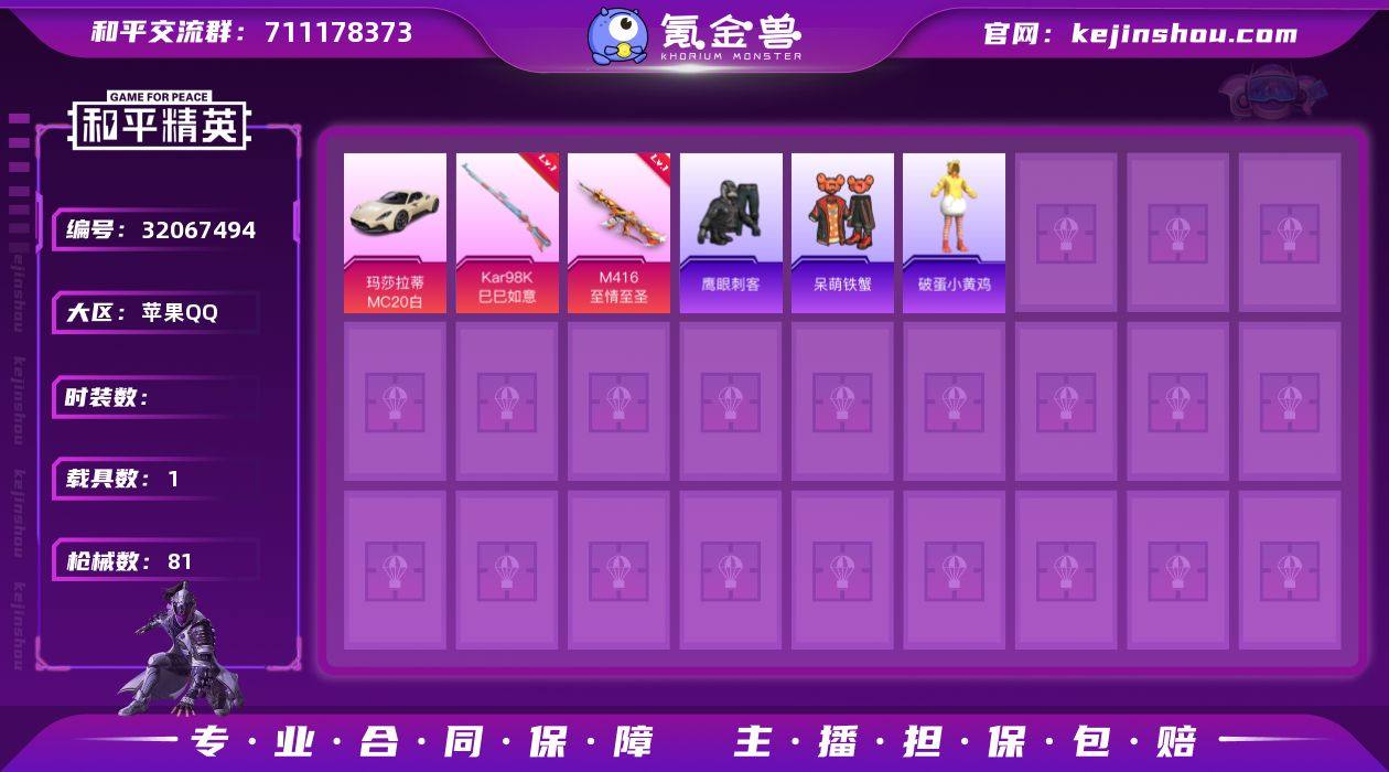 DYH18007+苹果手Q-1载具-2特效枪-56套装-81枪皮-1王牌印记-坚韧铂金Ⅴ-22894热力值【1载具】玛莎拉蒂MC20(星石白)【2特效枪】Kar98K-巳巳如意[4级],M416-至情至圣[6级]【135其它衣服和枪皮】SS21特训,SS20特训,都市魅力,元素星魂,SS30特训,登山爱好者,白糯汤圆,黑色伏地魔,SS23特训,破蛋小黄鸡,SS25特训,蝶变,白色伏地魔,魅力单车,牛气满满,SS29特训,耀粉歌者,SS19特训,SS22特训,冰河战士,SS32特训,贵族骑装,SS31特训,霓虹极客,萌趣咩咩,萌黄之夏,龙的传人,SS36特训,青翼流星,特训学院,竞技名士,夏日音浪,鹰眼刺客,炫蓝之夏,绯格组合,疯狂小兔子,湖蓝色名流,呆萌铁蟹,麻辣教官,黄色运动,冰川特警,幻世战舞者,角色-阿奴,音速流光,飞驰魅影,SS34特训,长空猛禽,电音精灵,娇憨猪猪,牛气冲天,龙魂突击队,幻影武者,战术大师,探宝勇士,冷焰舞者,玉兔迎春,AKM-破晓战魂,UMP45-生命誓言,撬棍-幻世战舞者,S12K-垂柳戏鸭,MP5K-异彩先驱,MG3-乌木金纹,撬棍-冰晶雪宝,Mini14-异彩先驱,ACE32-冰晶雪宝,S12K-娇憨猪猪,SCAR-L-红色方程式,Mk47-乌木金纹,UMP45-蓝色火焰,汤姆逊-天降萌叽,S12K-破晓战魂,VSS-彩虹符号,AKM-彩虹符号,UZI-天降萌叽,M416-蓝色火焰,Vector-生命誓言,平底锅-异彩先驱,AC-VAL-彩虹甜喵,Mk14-乌木金纹,莫辛纳甘-乌木金纹,平底锅-娇憨猪猪,S1897-糯团青竹,AUG-天降萌叽,S1897-飞驰魅影,蜜獾-娇憨猪猪,S686-生命誓言,SCAR-L-玉兔迎春,M416-糯团青竹,DBS-彩虹符号,SKS-炫彩节奏,S1897-炫彩节奏,P1911-冰封烈焰,M416-红色方程式,S12K-幻世战舞者,M16A4-幻世战舞者,M249-破晓战魂,AWM-天降萌叽,QBZ-飞驰魅影,MG3-幻世战舞者,DP-28-彩虹符号,MG-36-薄荷星砂,Kar98