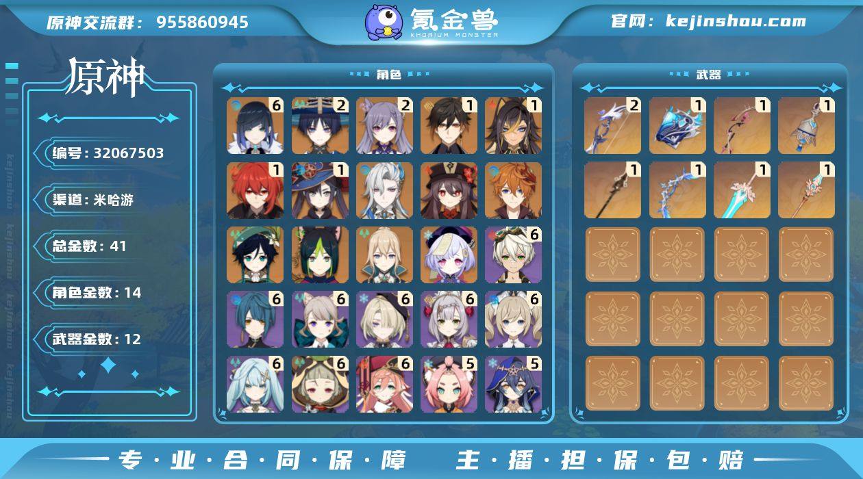 邮箱: 未绑定 总黄数: 41 冒险等级: 56 6命金色角色: 满命夜兰 2命金色角色: 二命刻晴,二命流浪者 1命金色角色: 一命迪卢克,一命钟离,一命莫娜,一命迪希雅 0命金色角色: 温迪,七七,达达利亚,琴,胡桃,提纳里,那维莱特 拥有武器: 天空之傲,贯虹之槊,天空之脊,冬极白星,若水,图莱杜拉的回忆,最初的大魔术,万世流涌大典 2精武器: 若水 1精武器: 天空之傲,贯虹之槊,天空之脊,冬极白星,图莱杜拉的回忆,最初的大魔术,万世流涌大典
